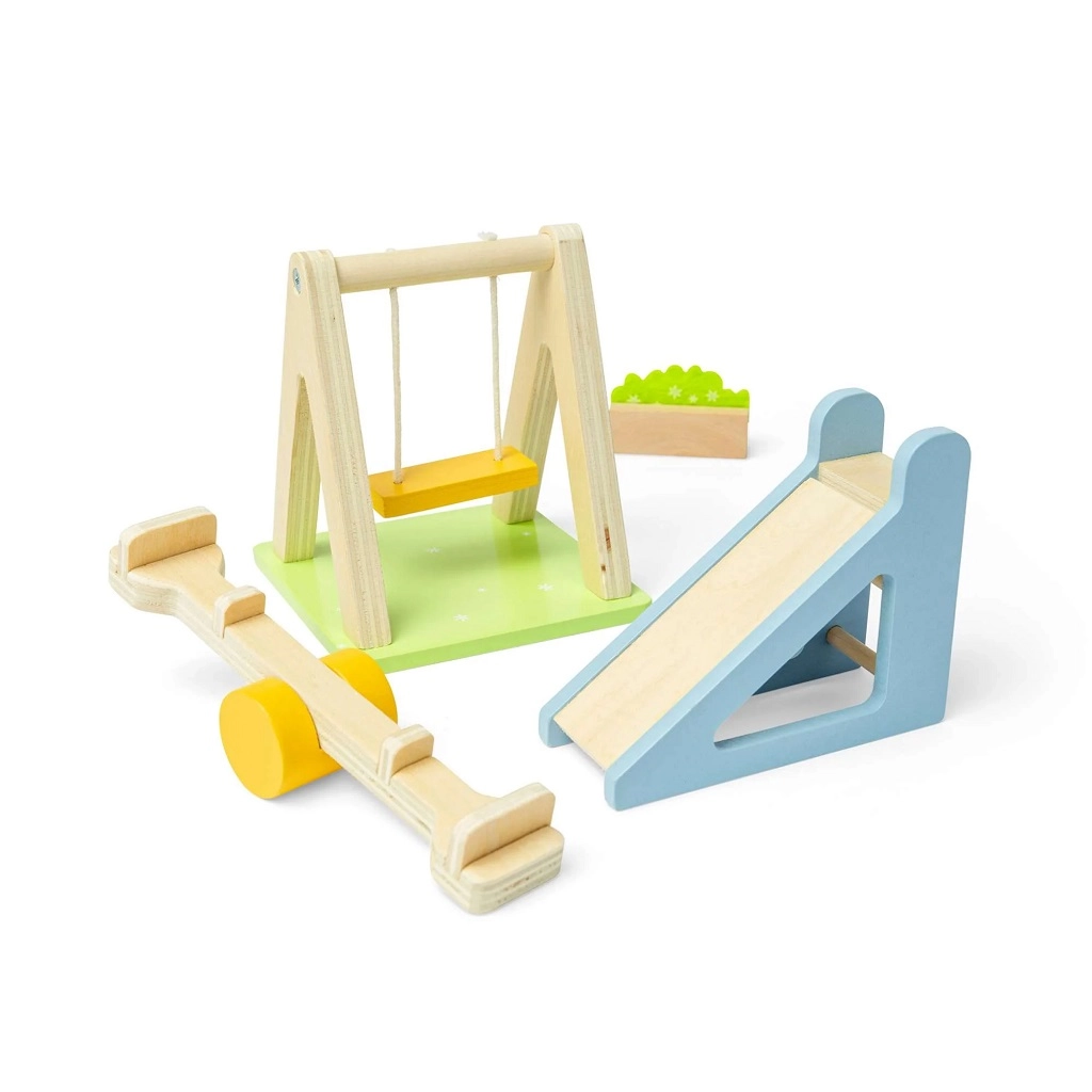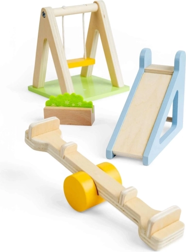 Paverskite savo lėlių namelio sodą vieta, kupina judesio ir vaizduotės. Rinkinyje yra mėgstamiausi žaidimų aikštelės elementai – supynės, čiuožykla, svirtis (balansinės sūpynės) ir dekoratyvinė gėlių lysvė. Dėl lygių medinių detalių švelnių pastelinių spalvų malonu ir saugu žaisti.