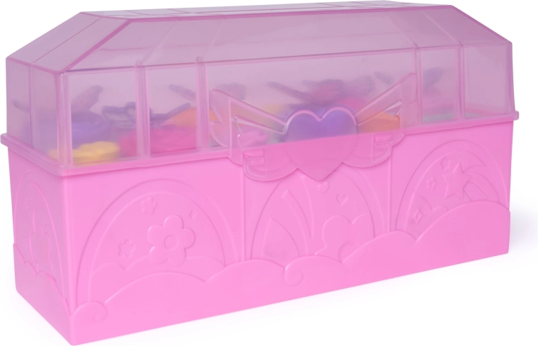 - Rožinis lagaminėlis su permatomu dangteliu, skyreliai figūrėlėms ir priedams
