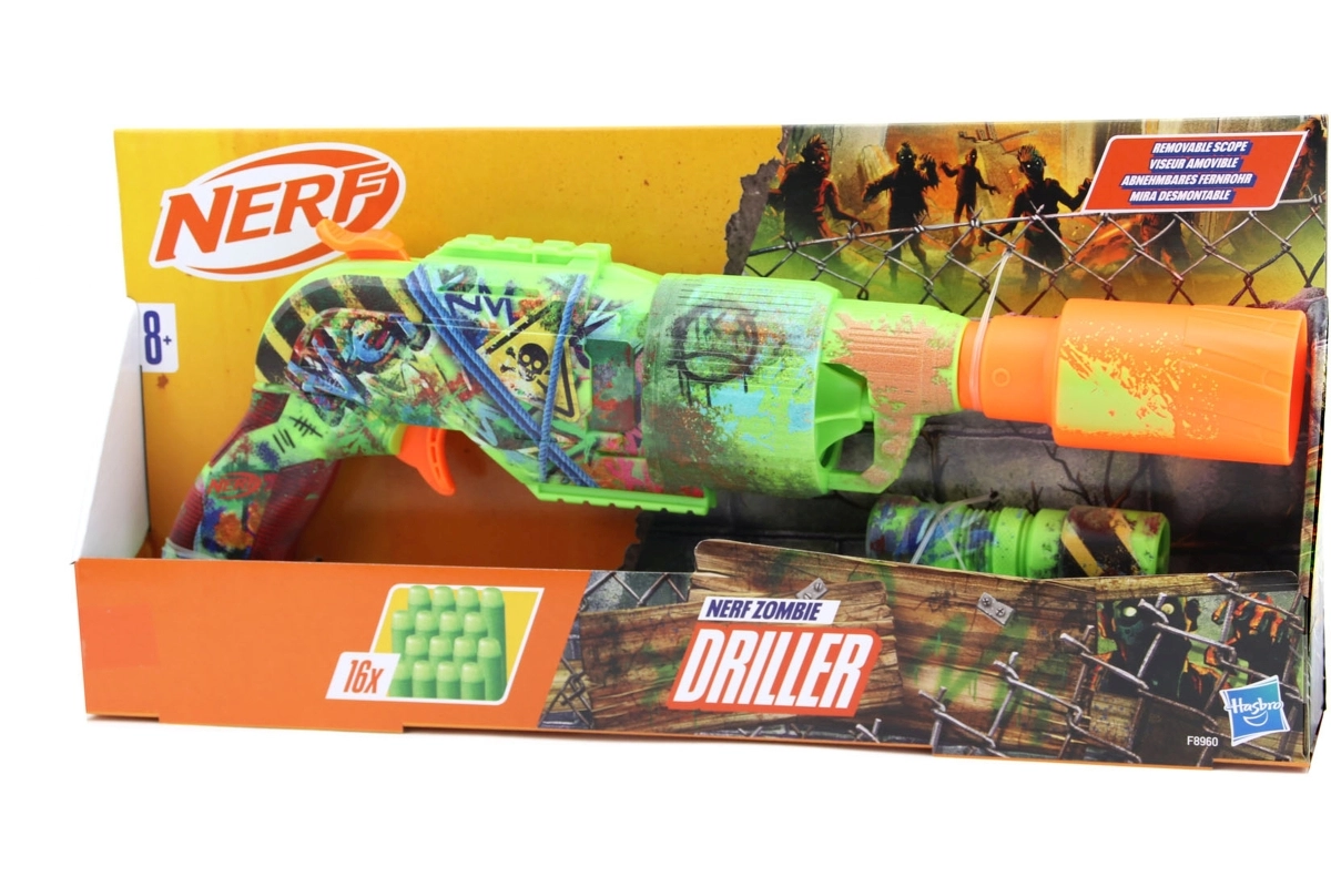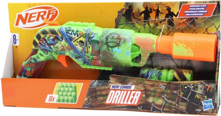 Nerf Zombie Driller blasteris suteikia unikalią išvaizdą, įkvėptą zombių pasaulio – jis atrodo kaip į kovą paruoštas transformuotas grąžtas. Įtraukiantys grafičio piešiniai ir smagios detalės paverčia jį puikiu priedu teminiams žaidimams, vakarėliams ir veiksmo dvikovoms su draugais. Nuimamas taikiklis padeda taikytis, o 16 strėlyčių pakuotėje užtikrina daug pramogų.