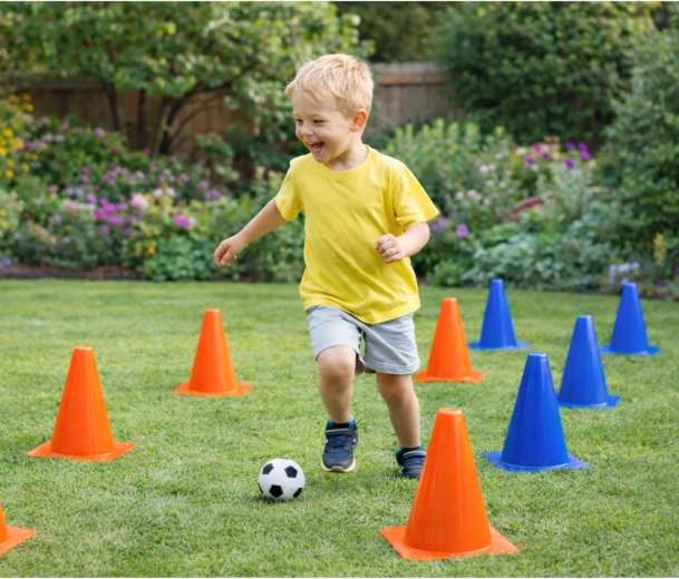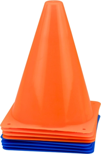 Sodrios oranžinės ir mėlynos spalvos kūgeliai padeda vaikams geriau sekti trasą ir didina treniruotės saugumą aikštėje ar kieme.