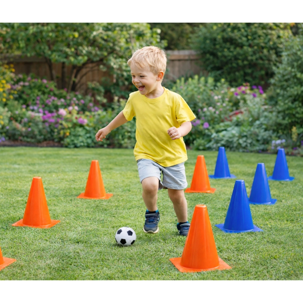 Universalus treniruočių rinkinys lavina vaikų koordinaciją, pusiausvyrą ir greitį. Ryškios spalvos puikiai matomos ant žolės, aikštėje ir sporto salėje, o 8 cm skersmens kamuoliukas tinka slalomui, tiksliems perdavimams ir komandos žaidimams. Patvari plastikinė konstrukcija užtikrina saugų ir ilgalaikį naudojimą.