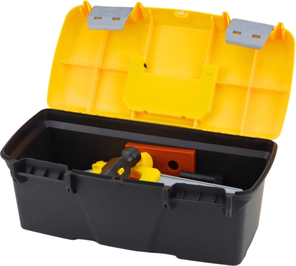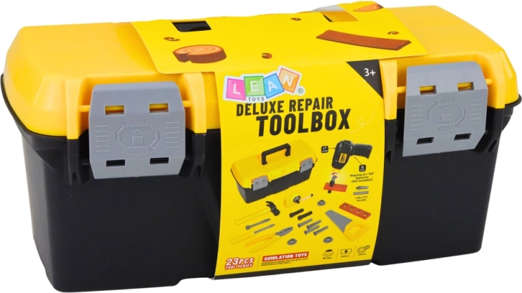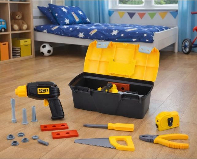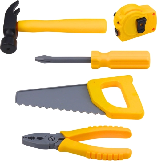 Šis praktiškas vaikiškas įrankių rinkinys turi viską, ko reikia mažajam taisytojui: akumuliatorinį gręžtuvą, plaktuką, pjūklelį, atsuktuvą, reples, metrą, varžtus ir konstravimo detales. Patvari spintelė su rankena viską laiko tvarkingai kartu ir palengvina nešiojimą kelionėse.