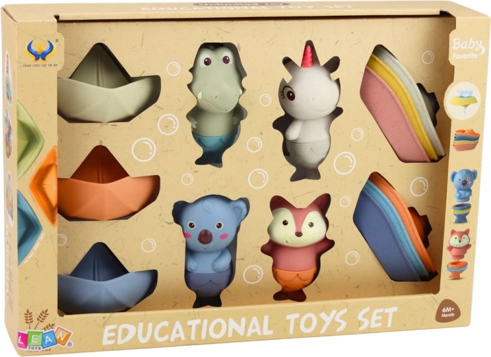 Spalvingas maudynių žaislų rinkinys pavers kiekvieną maudymąsi smagiu nuotykiu. Sudėtyje 13 dalių: atjungiami guminiai gyvūnėliai, plastikiniai laiveliai ir guminės valtelės, kurios plūduriuoja vandenyje ir paspaudus purškia. Minkšta, saugi medžiaga ir galimybė jungti dalis lavina smulkiąją motoriką, rankų ir akių koordinaciją bei jutiminę raidą.