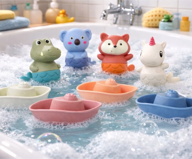 Saugūs minkšti guminiai gyvūnėliai puikiai telpa vaiko delne, plastikiniai laiveliai ir guminės valtelės skatina vaizduotę vandens nuotykiuose vonioje, baseine ar vasaros žaidimuose lauke.