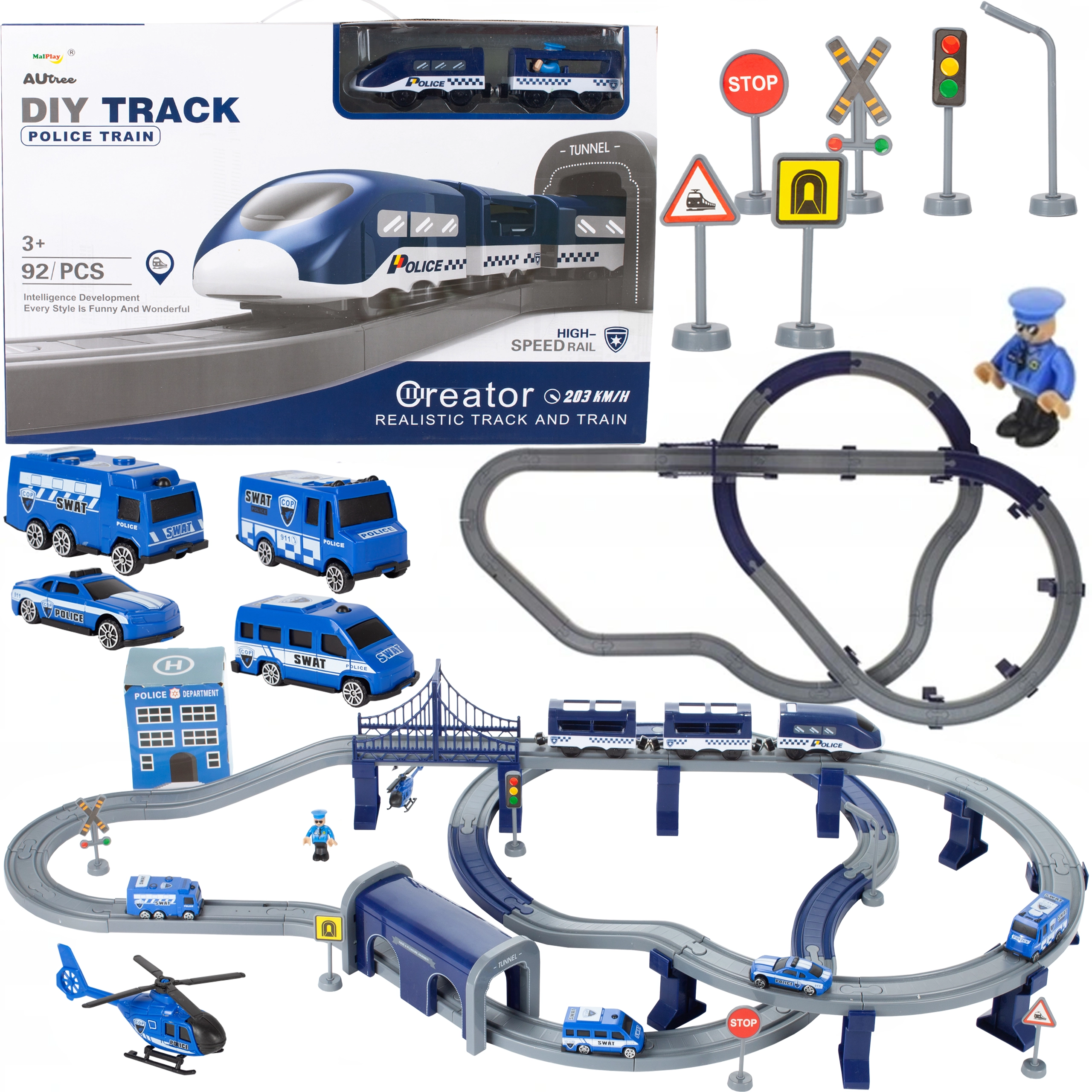 Ši policijos traukinių trasa suteiks valandų valandas pramogų maždaug 103 × 61 × 15 cm plote. Vaikai gali kurti savo miesto scenas – nuo traukinio starto, per pervažas iki sraigtasparnio veiksmų. Lokomotyvas maitinamas baterijomis ir papildo žaidimą garsais, kurie suteikia realistišką atmosferą.