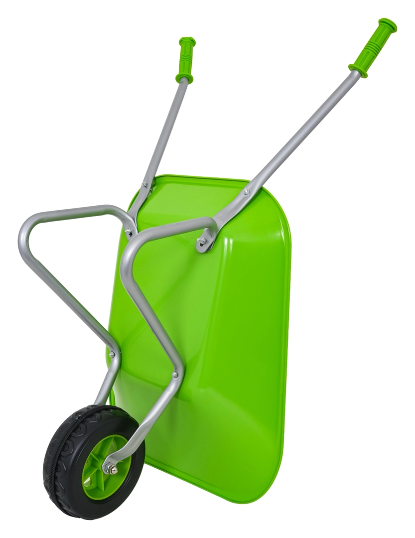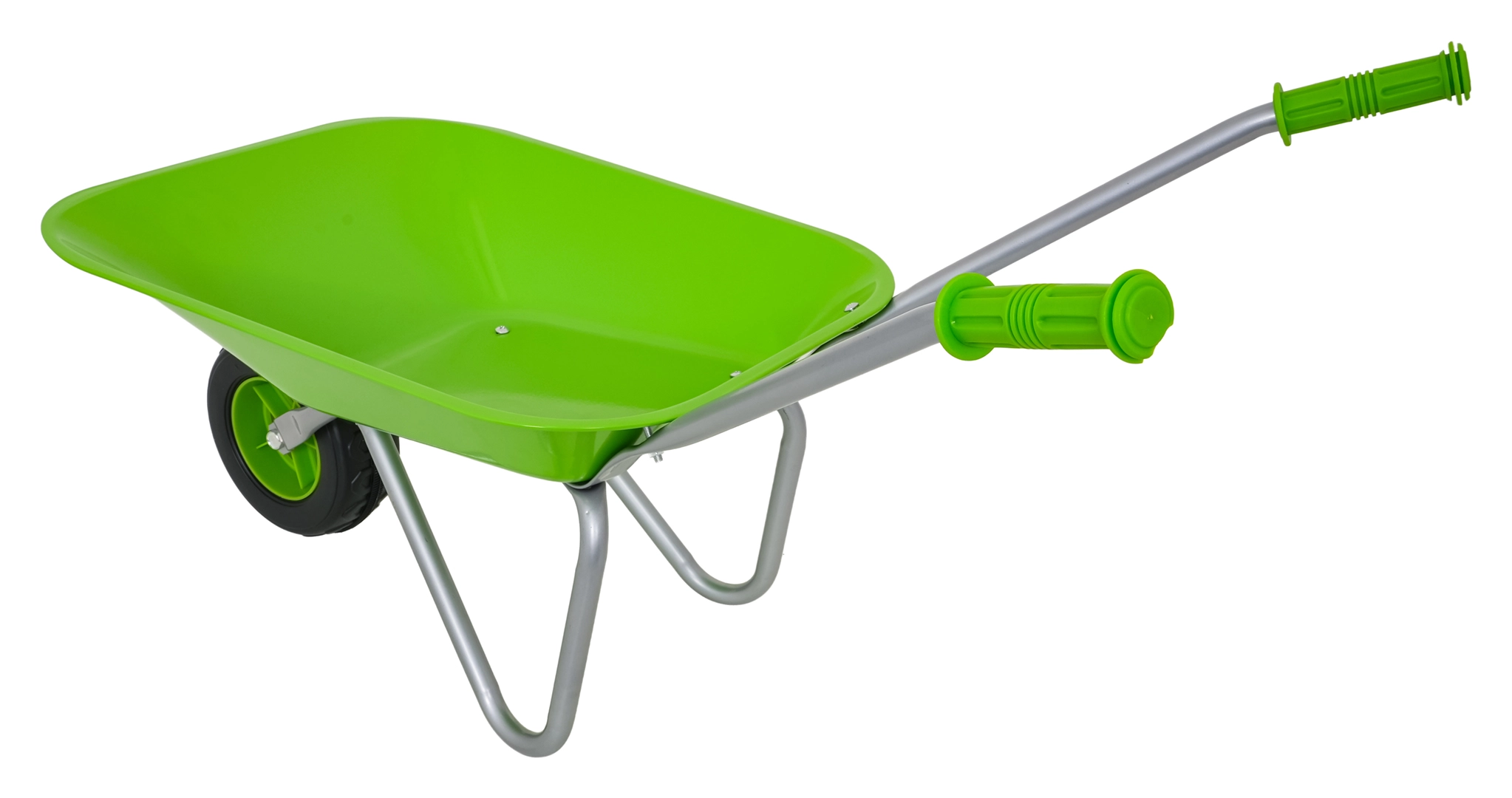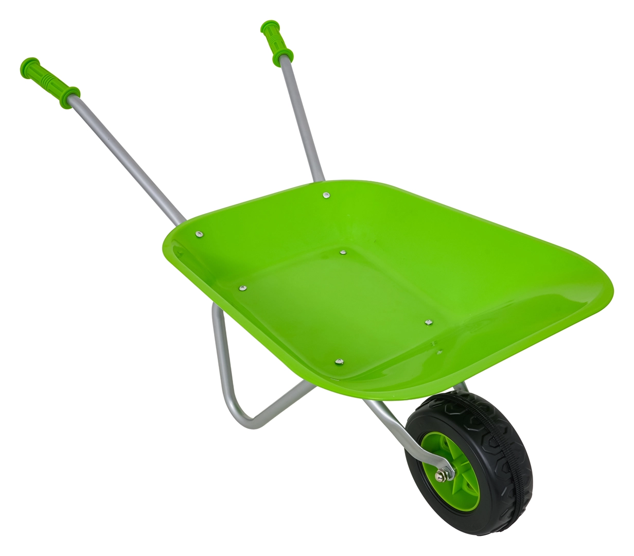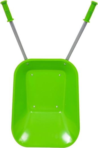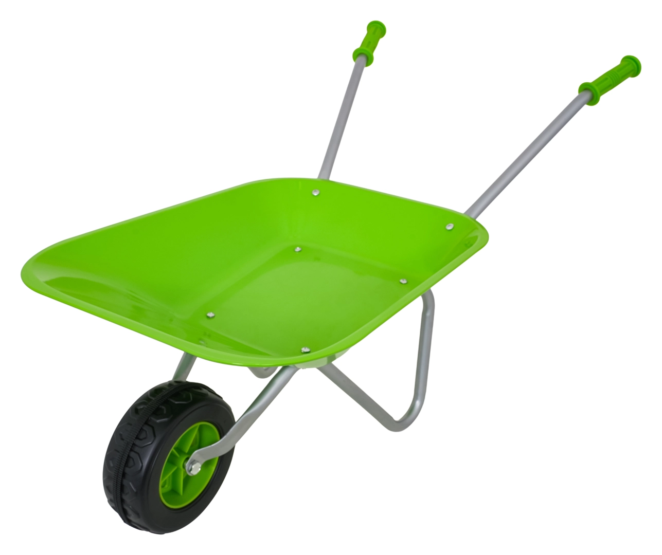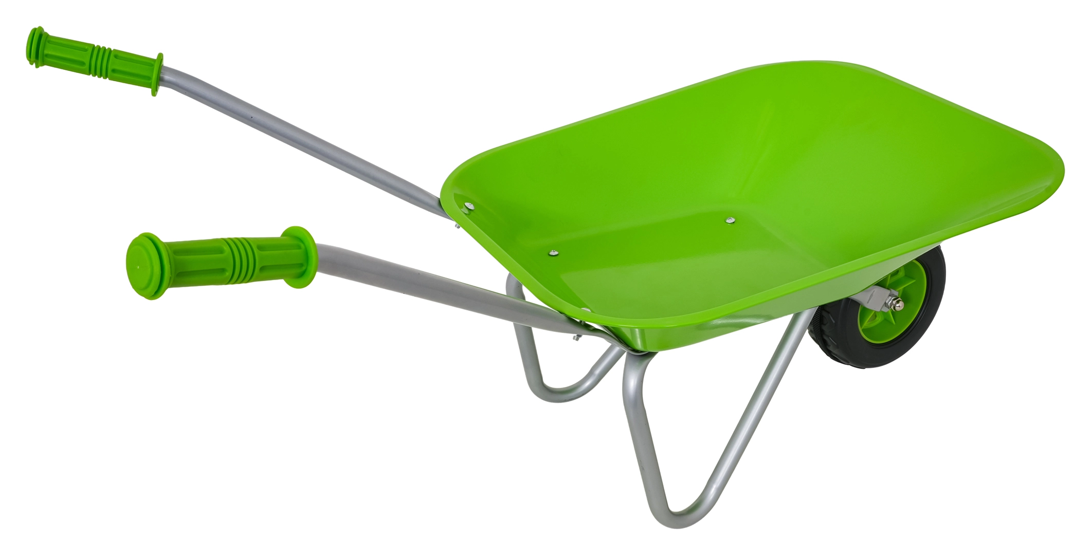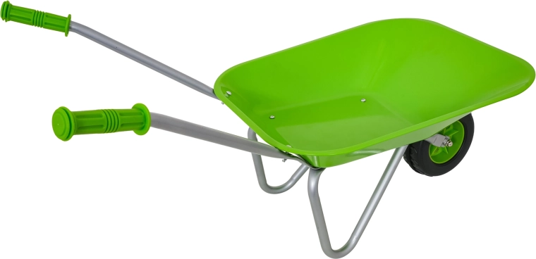 Lengvas ir stabilus vaikiškas karutis su plačia loviu ir vienu ratu puikiai tinka žemei, lapams ir smulkiems įrankiams. Ergonomiškos rankenos su neslystančiomis gumomis palengvina valdymą.