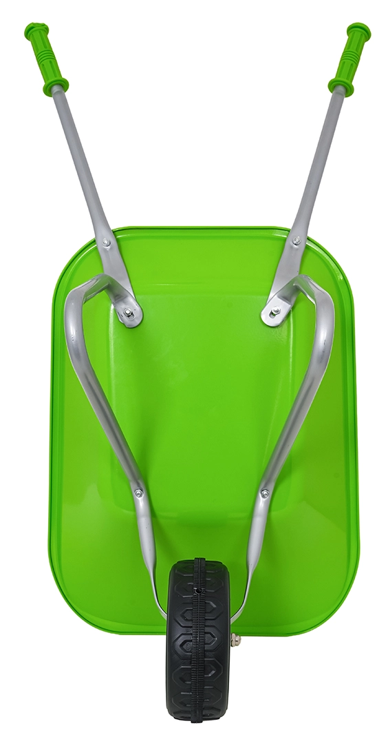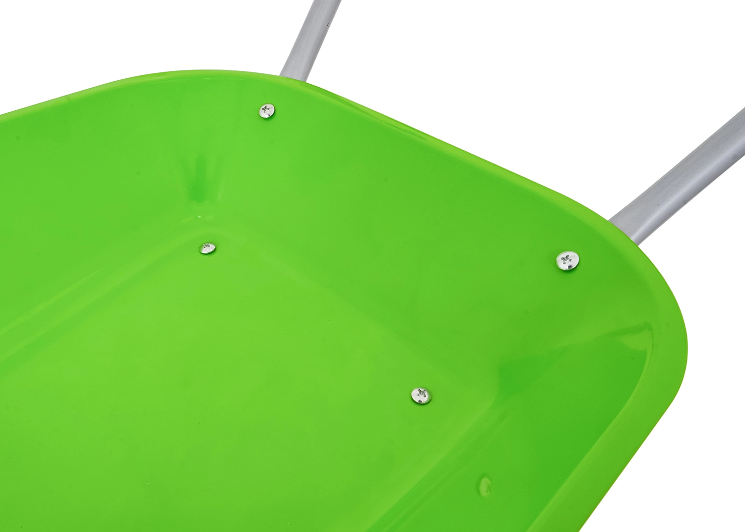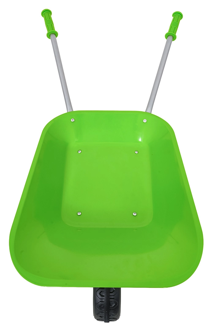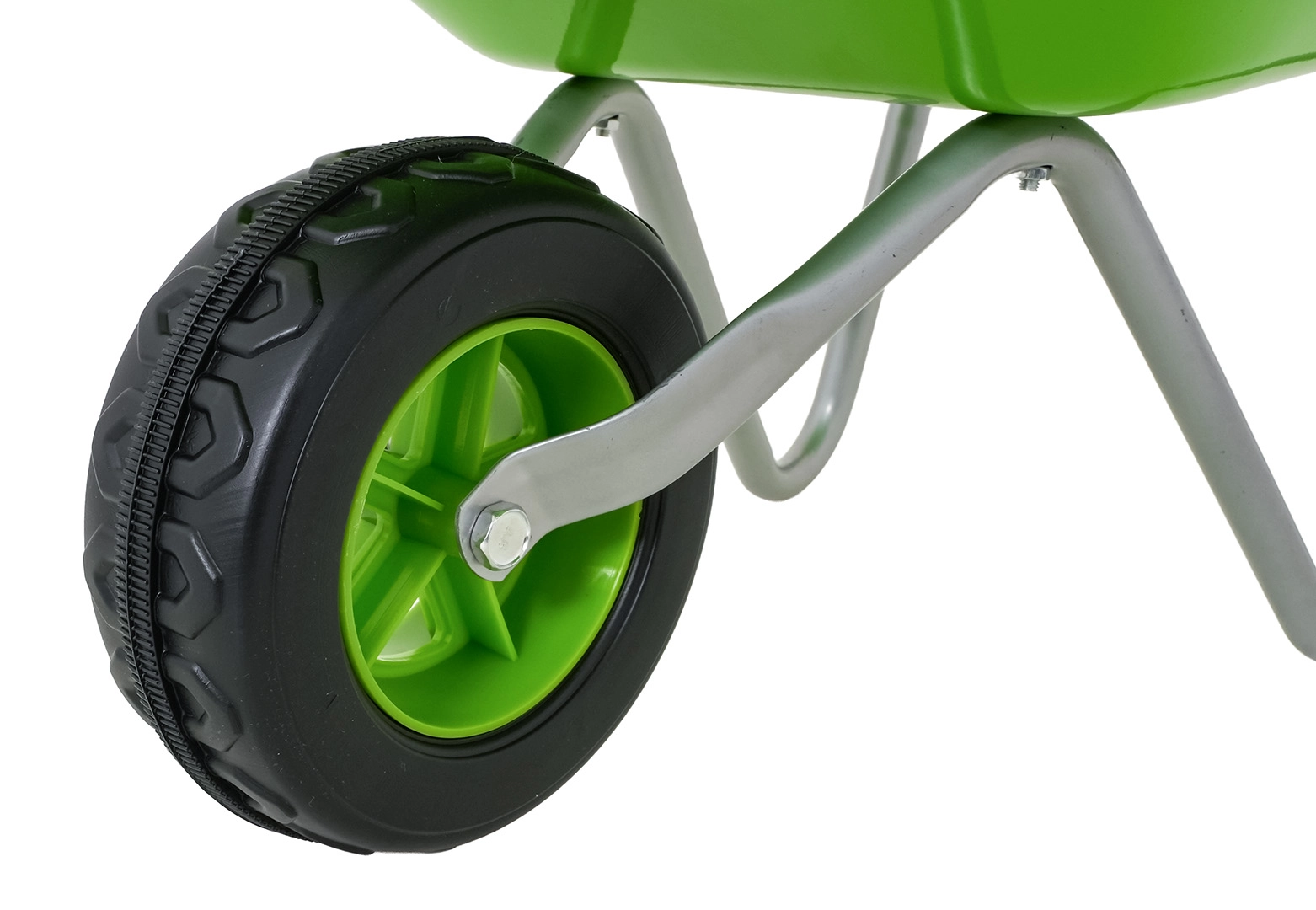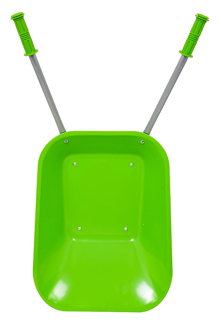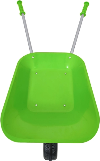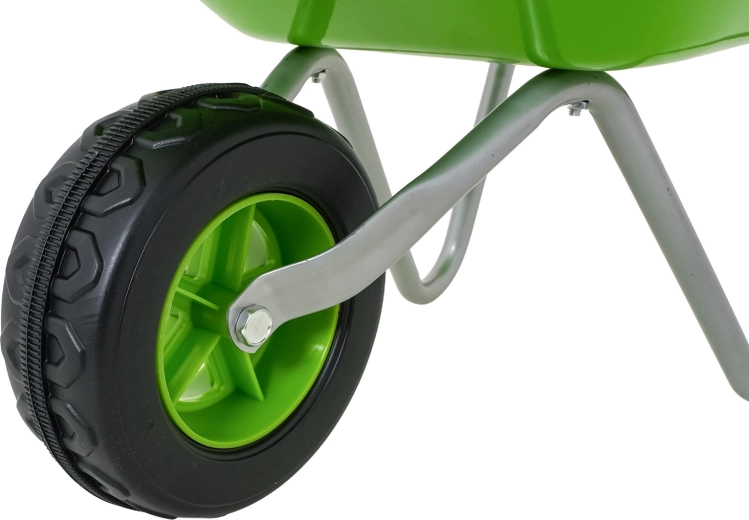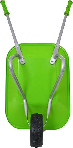 Lengvas ir stabilus vaikiškas karutis su plačia loviu ir vienu ratu puikiai tinka žemei, lapams ir smulkiems įrankiams. Ergonomiškos rankenos su neslystančiomis gumomis palengvina valdymą.