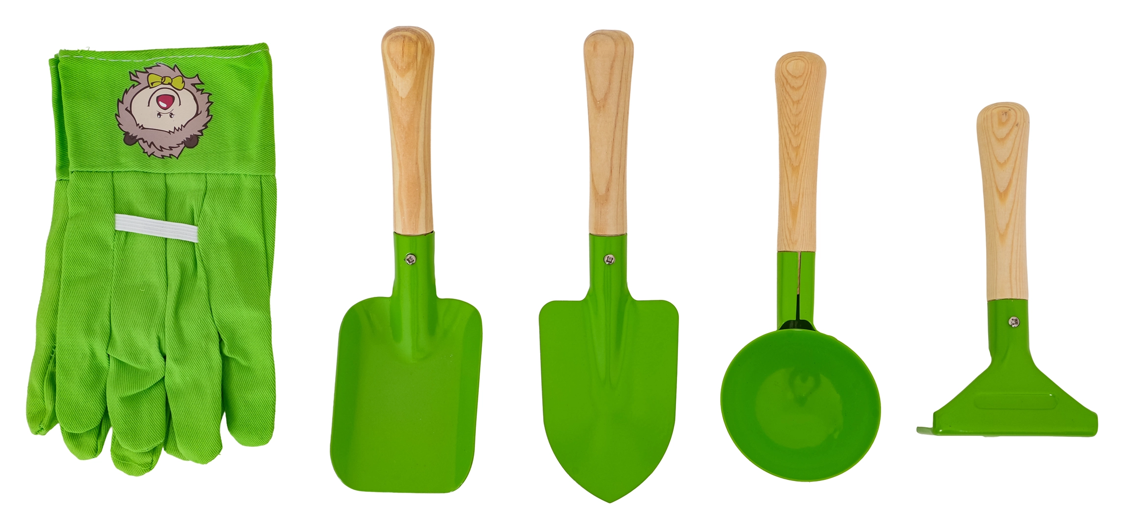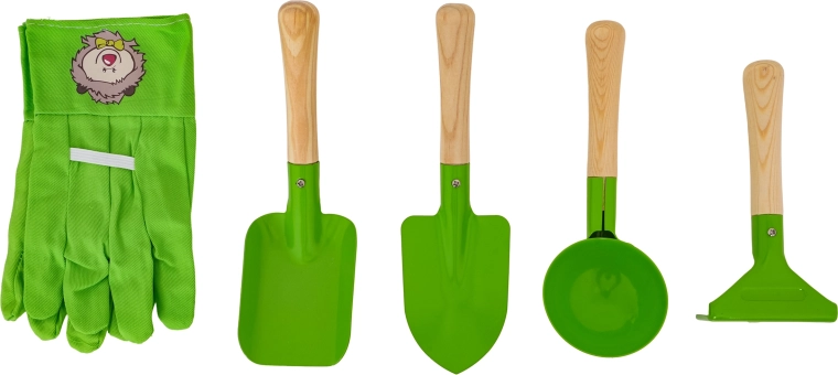 Ką rasite rinkinyje: karutį, lygų kastuvą, smailią sodinimo mentelę, apvalų žemės samtelį, mažas grėbles/gramdiklį ir vaikiškas pirštines. Metalinės dalys yra atsparios rūdijimui, medinės rankenos pritaikytos mažai rankai, o visą rinkinį galima greitai ir lengvai surinkti.