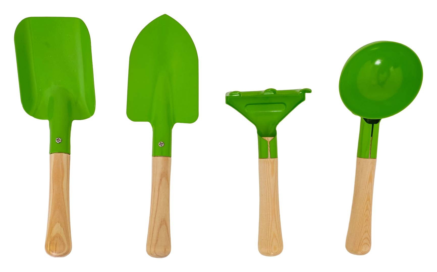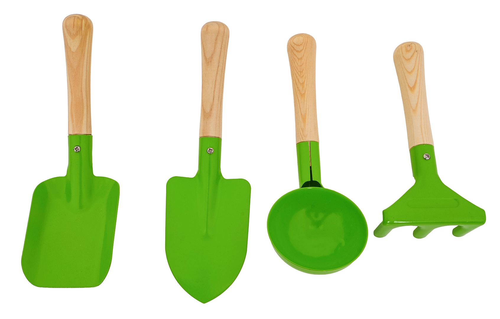 Rinkinyje yra kastuvas, smailus sodinimo mentele, apvalus samtelis ir mažos grėblės. Tvirtos metalinės galvutės ir lygios medinės rankenos užtikrina patogumą ir ilgaamžiškumą.