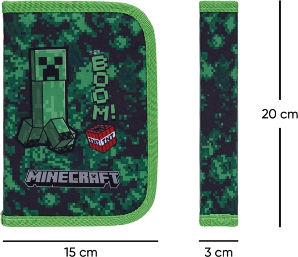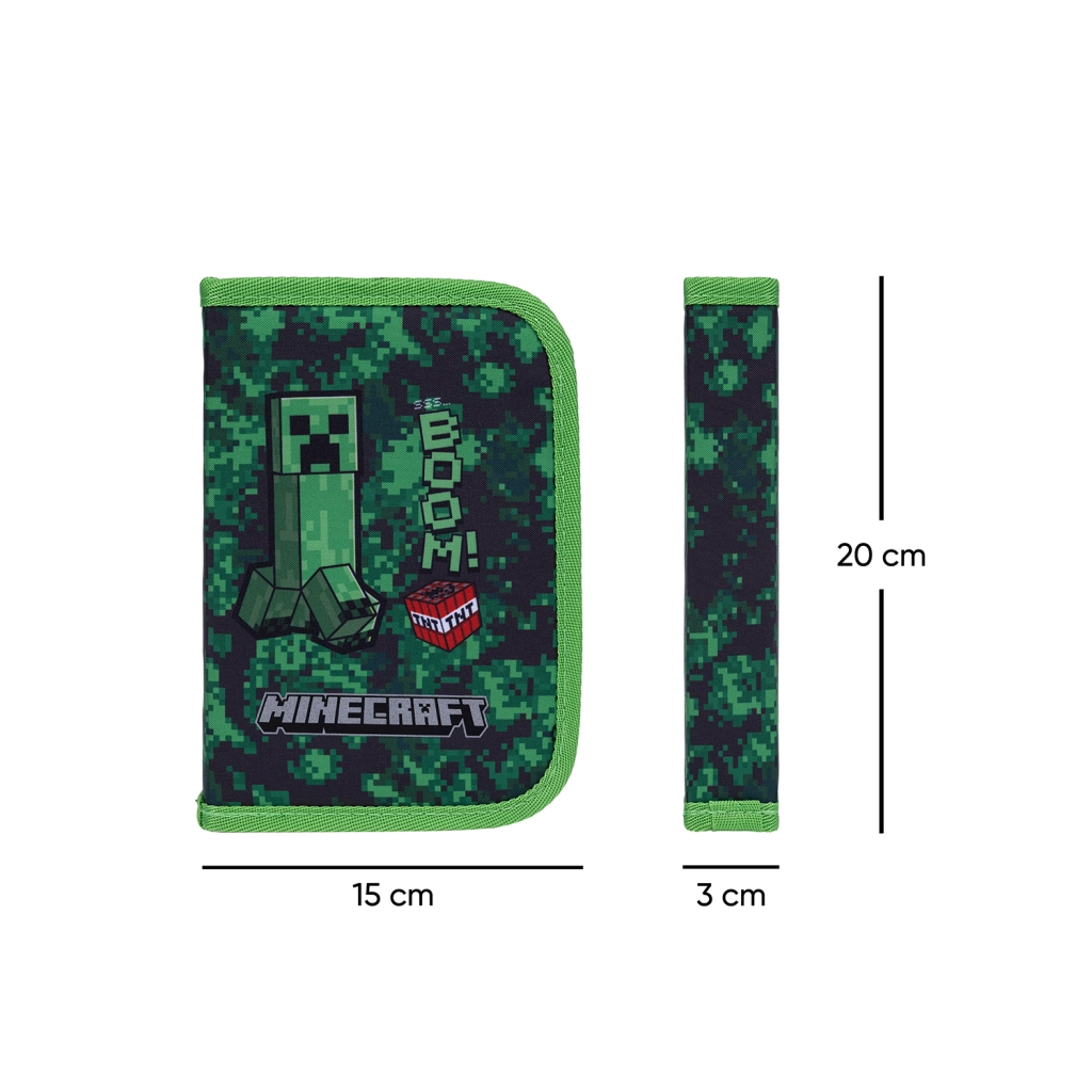 Stilingas mokyklinis penalas su MINECRAFT Boom motyvu siūlo praktinį vieno skyriaus dizainą su dviem atvartais, patvarų YKK užtrauktuką ir aiškų išdėstymą. Viduje rasite kišenėlę smulkmenoms, langelį tvarkaraščiui ir tvirtas gumeles, suderinamas ir su trikampiais pieštukais bei flomasteriais. Penalas yra be užpildo ir pagamintas iš perdirbtos medžiagos.