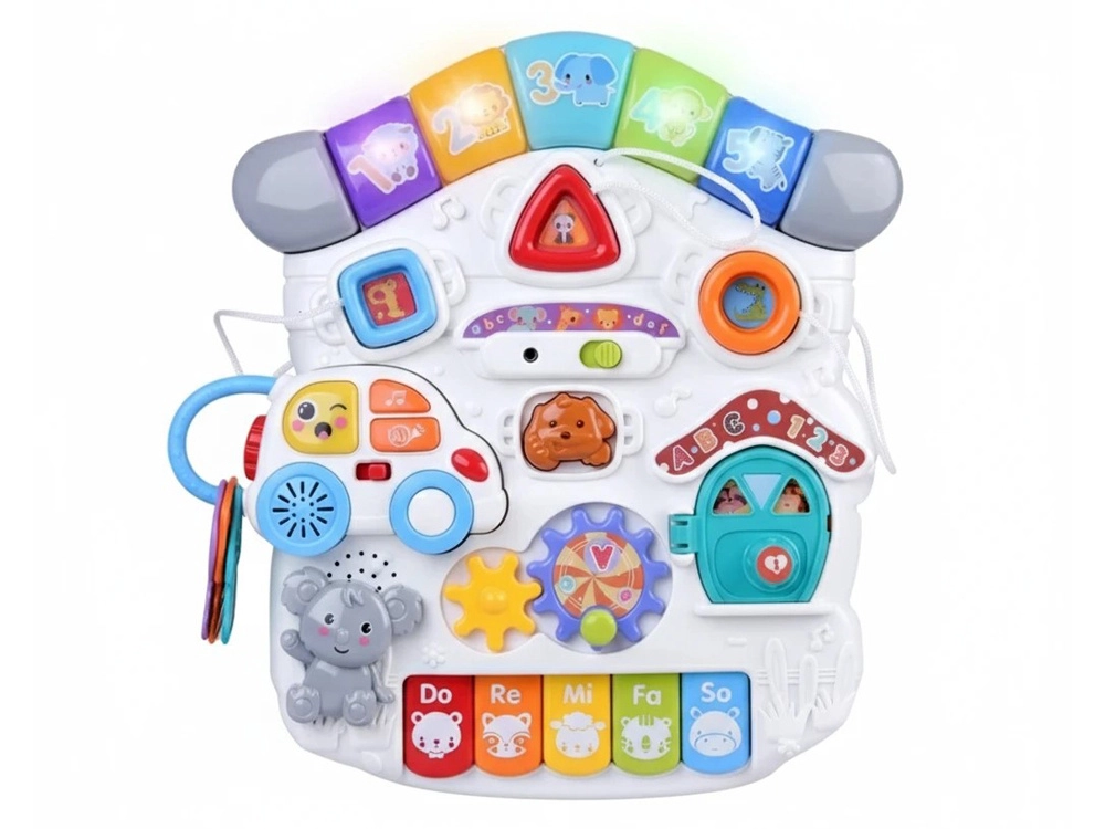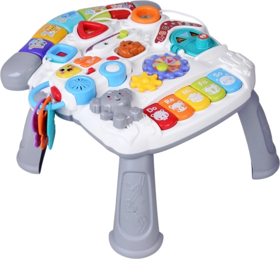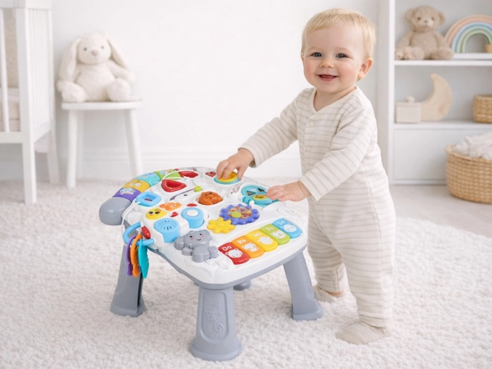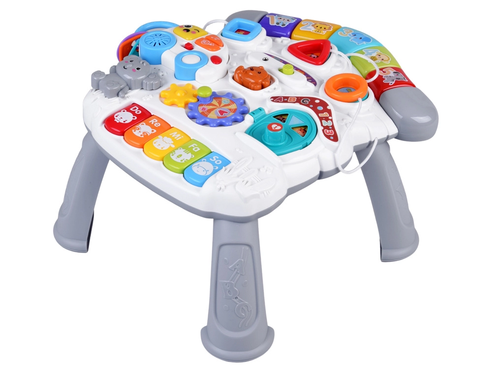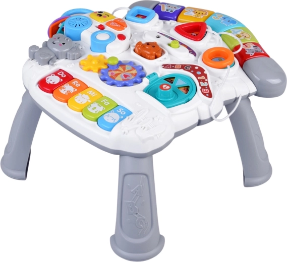 Spalvingas interaktyvus staliukas patiems mažiausiems – tai mažas atradimų ir muzikos centras. Jis siūlo šviesos efektus, melodijas, mini pianiną Do-Re-Mi, sukamus krumpliaračius, formų ir gyvūnėlių mygtukus, nuimamą automobilį su rakteliais ir mikrofoną. Lavina smulkiąją motoriką, rankos ir akies koordinaciją, moko spalvų, formų ir garsų bei skatina savarankišką žaidimą.