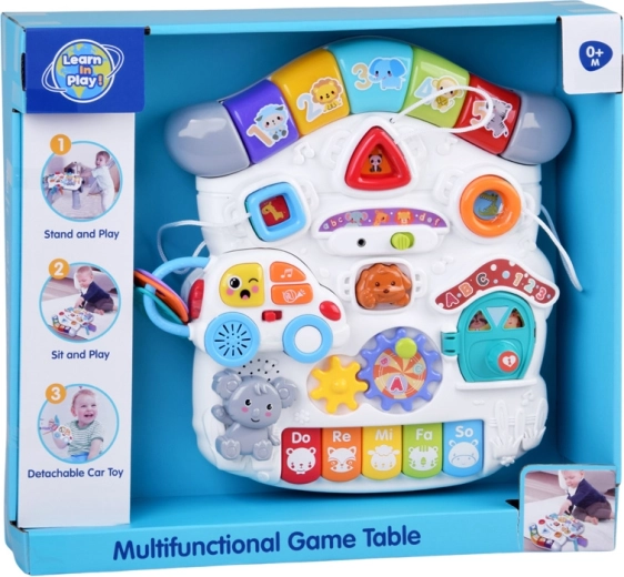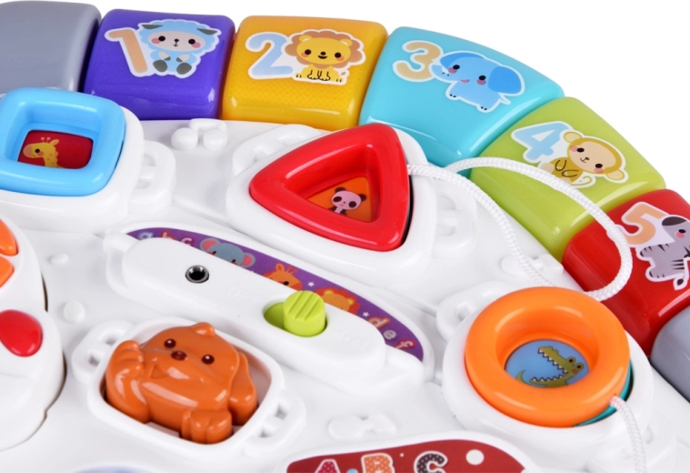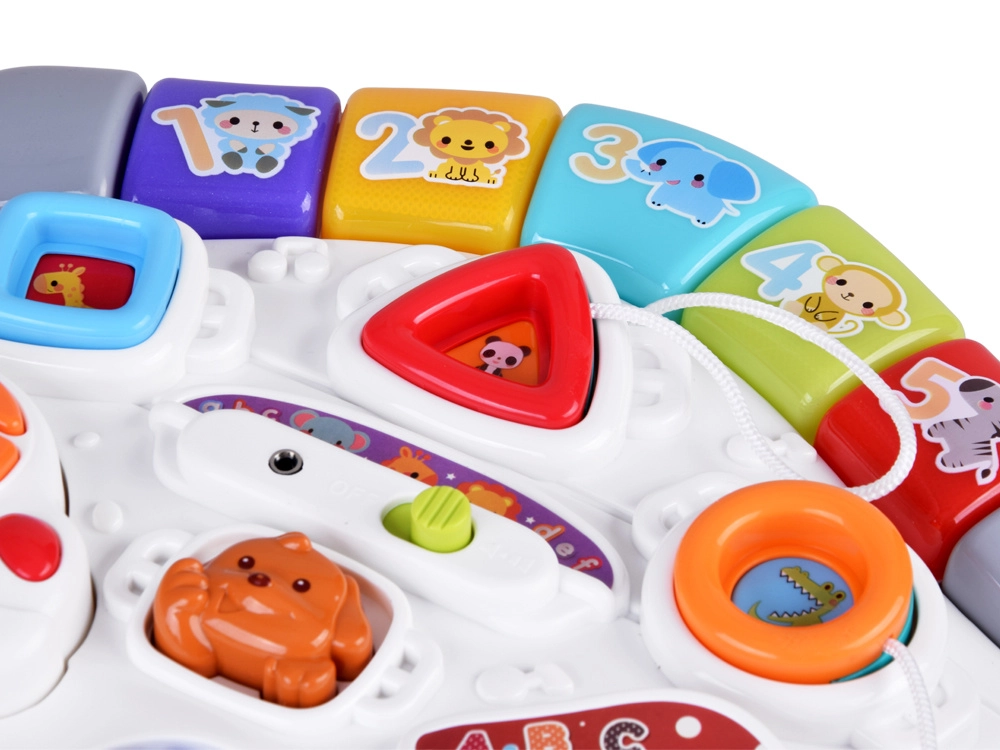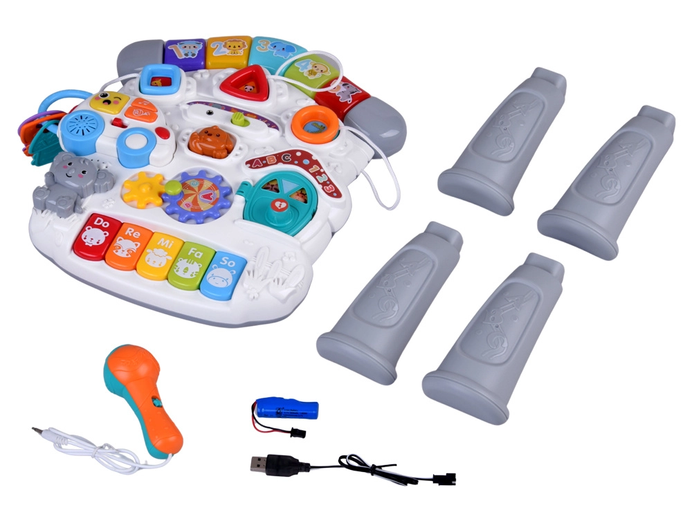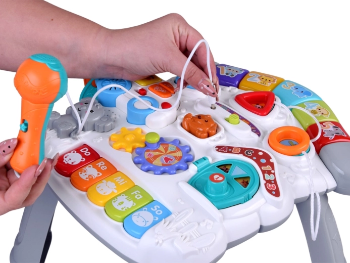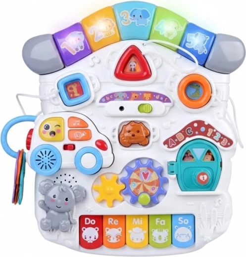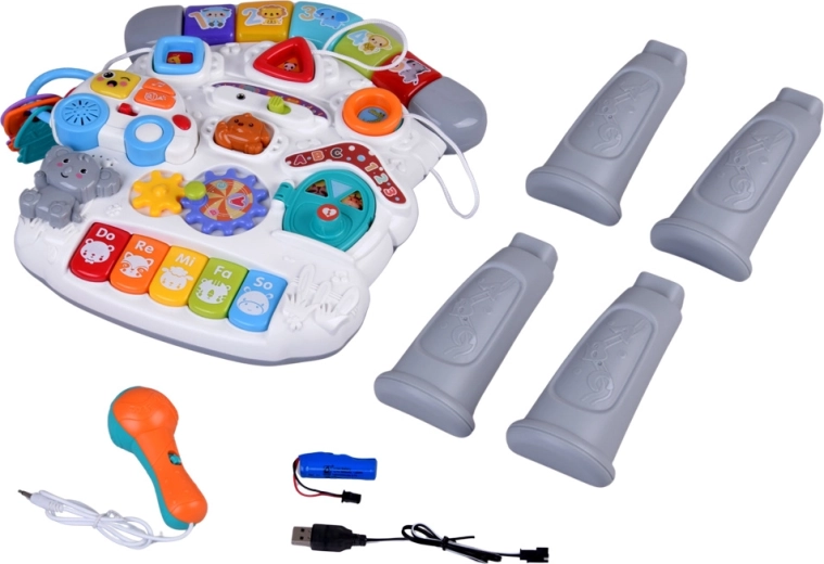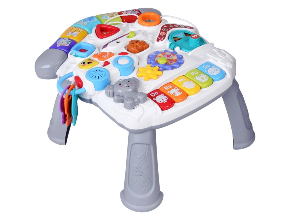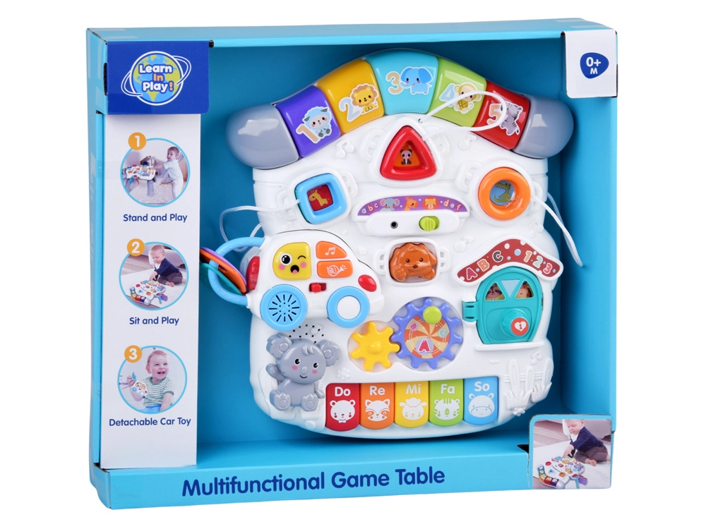 Muzikinis skydelis su Do–Re–Mi klaviatūra, mikrofonu ir įdomiais efektais skatina jutiminę raidą ir ritmo pojūtį. Formų skydelis padeda pažinti spalvas, formas ir gyvūnėlius, o nuimamas automobilis su rakteliais leis žaisti ir be staliuko. Dėl gausios sąveikos vaikai lavina suėmimą, dėmesio koncentraciją ir loginį mąstymą.