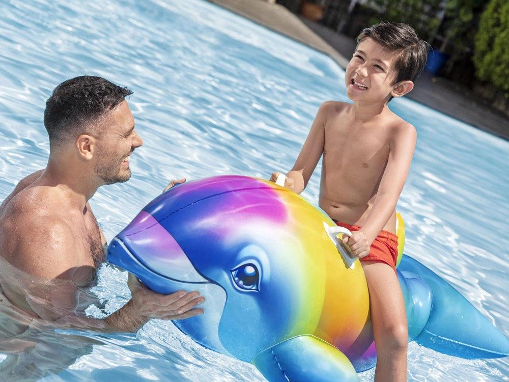 Įvairiaspalvis delfino formos dizainas sužavės vaikus ir skatins aktyvų žaidimą vandenyje. Plūduras tinka baseinams, ežerams ir ramiems jūros vandenims, o dėl lengvos konstrukcijos jį patogu nešiotis ir laikyti. Greitą pripūtimą ir išleidimą įvertinsite per kiekvieną išvyką prie vandens.