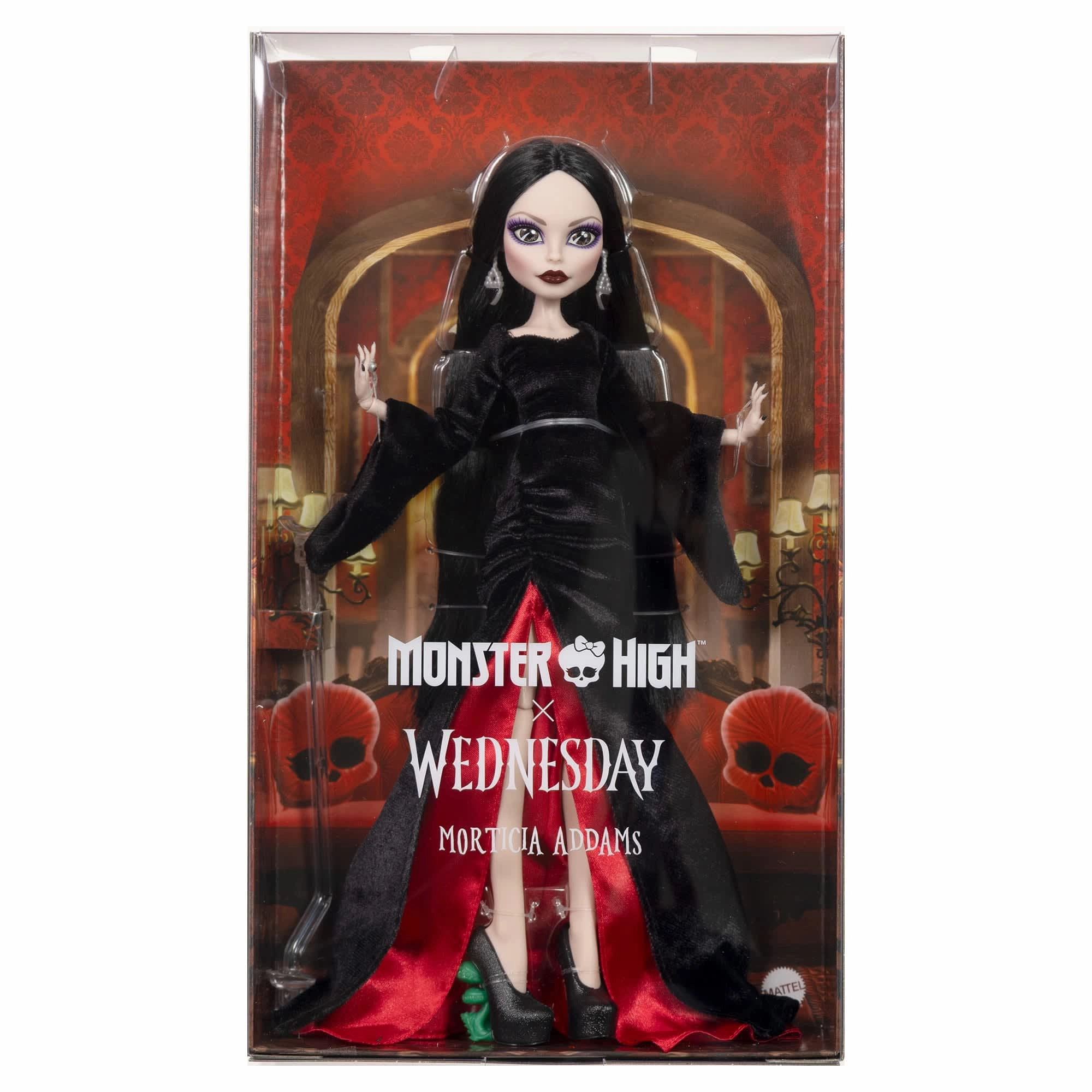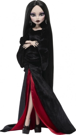 Atraskite tamsią garsios herojės MORTICIA ADDAMS eleganciją Monster High Collector kolekcijoje. Lėlė žavi ilgais juodais suknelės siluetais su dramatiškai plačiomis rankovėmis, veliūrine tekstūra ir raudonais akcentais skeltuke. Realistiški įsišukuoti (rooted) plaukai, šviesi oda ir ryškus makiažas pabrėžia autentišką išvaizdą, pažįstamą iš serialo WEDNESDAY.