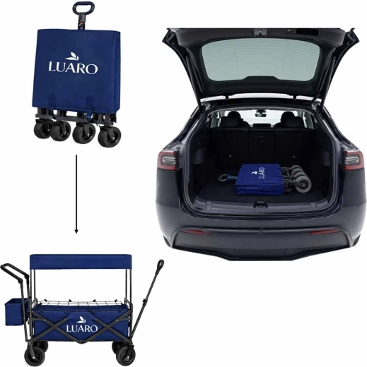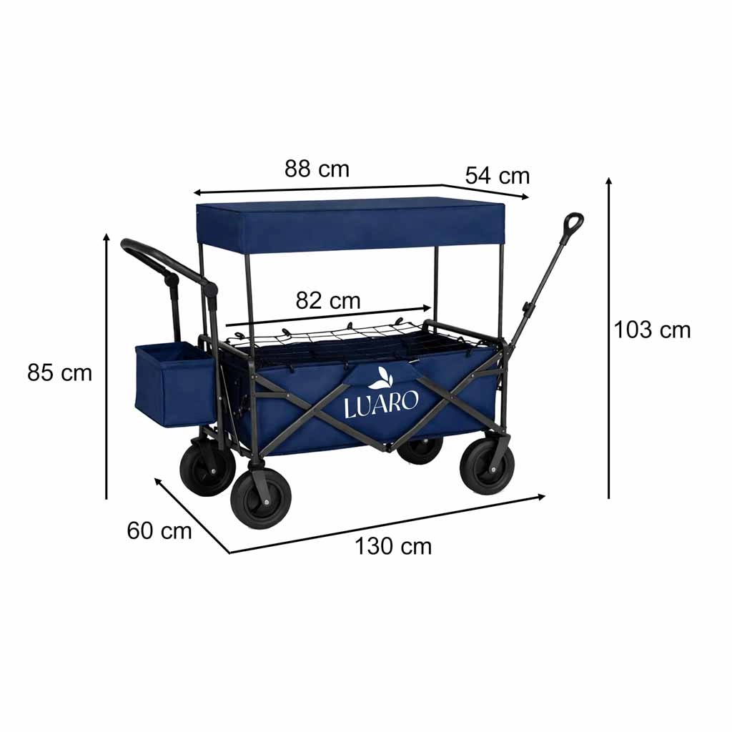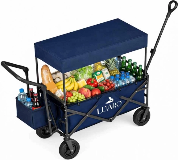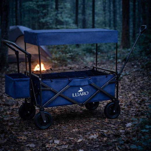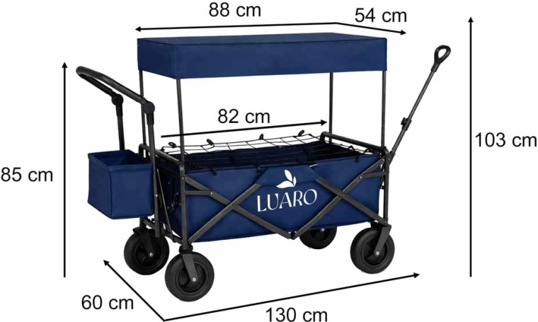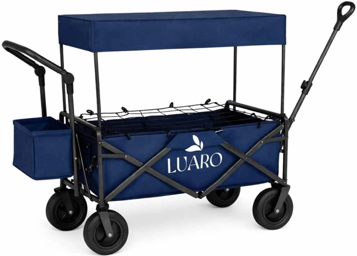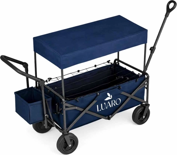 Universalus sulankstomas LUARO vežimėlis su stogeliu palengvina daiktų pervežimą į paplūdimį, stovyklavietę ar miestą. Dėl tvirtos konstrukcijos, plačių visureigių ratų, pasukamų priekinių ratukų ir reguliuojamų rankenų jį lengva valdyti. Praktiškas stogelis saugo turinį nuo saulės ir lengvo lietaus, o šoninės kišenės ir krepšys užtikrina tvarkingą daiktų laikymą.