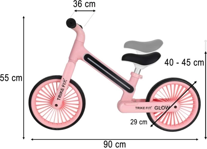 Balansinis dviratukas TRIKE FIX GLOW LED – idealus pirmasis „dviratis“ mažiesiems. LED apšvietimas rėme suteikia „wow“ efektą ir geresnį matomumą, o neslystančios rankenos ir stabilios EVA padangos užtikrina saugumą kiekvienos kelionės metu. Lengva konstrukcija skatina natūralų pusiausvyros mokymąsi ir sklandų perėjimą prie minamo dviračio.