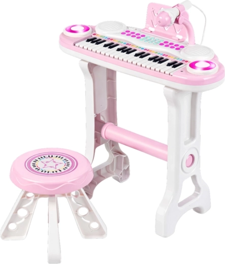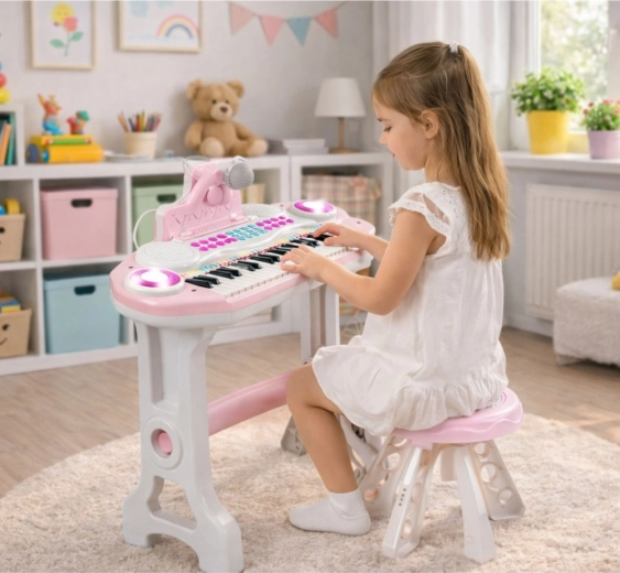 Lavinkite savo vaiko muzikinį talentą su rožiniais elektroniniais klavišais, turinčiais 37 klavišus, mikrofoną ir MP3 funkciją. Jie siūlo smagius ritmus, įvairius instrumentus, įrašymą ir atkūrimą, tempo ir garsumo reguliavimą bei LED šviesos efektus. Komplekte yra staliukas, taburetė ir natų stovas patogiam grojimui.