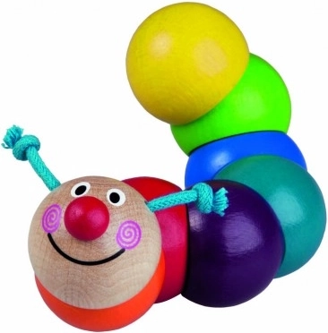 Spalvingas medinis vikšras iš karoliukų ant gumelės padeda lavinti smulkiąją motoriką jau nuo 6 mėnesių. Jis saugus sveikatai, atitinka ES standartus ir dėl kompaktiško 13 cm ilgio puikiai telpa į mažas rankutes.