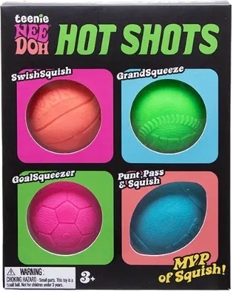 Antistresiniai kamuoliukai NeeDoh Hot Shots išpopuliarėjo socialiniuose tinkluose ir yra vieni mėgstamiausių jutiminių žaislų vaikams nuo 3 metų. Kiekvienas kamuoliukas turi skirtingą tekstūrą, jį galima maigyti, tempti ir mėtyti, o medžiaga visada sugrįžta į pradinę formą. Puikiai tinka atsipalaidavimui, dėmesio sutelkimui ir nusiraminimui dienos metu.