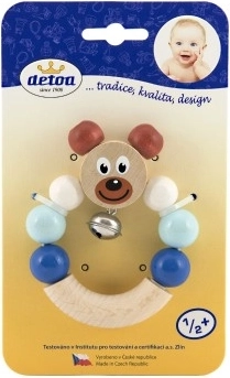 Mielas medinis barškutis su mėlynu meškiuku pradžiugins kiekvieną kūdikį nuo 6 mėnesių. Integruotas varpelis švelniai skamba, žaislas yra lengvas ir patogiai laikomas mažose rankytėse. Atitinka griežtus ES saugos standartus ir turi Saugių žaislų sertifikatą.