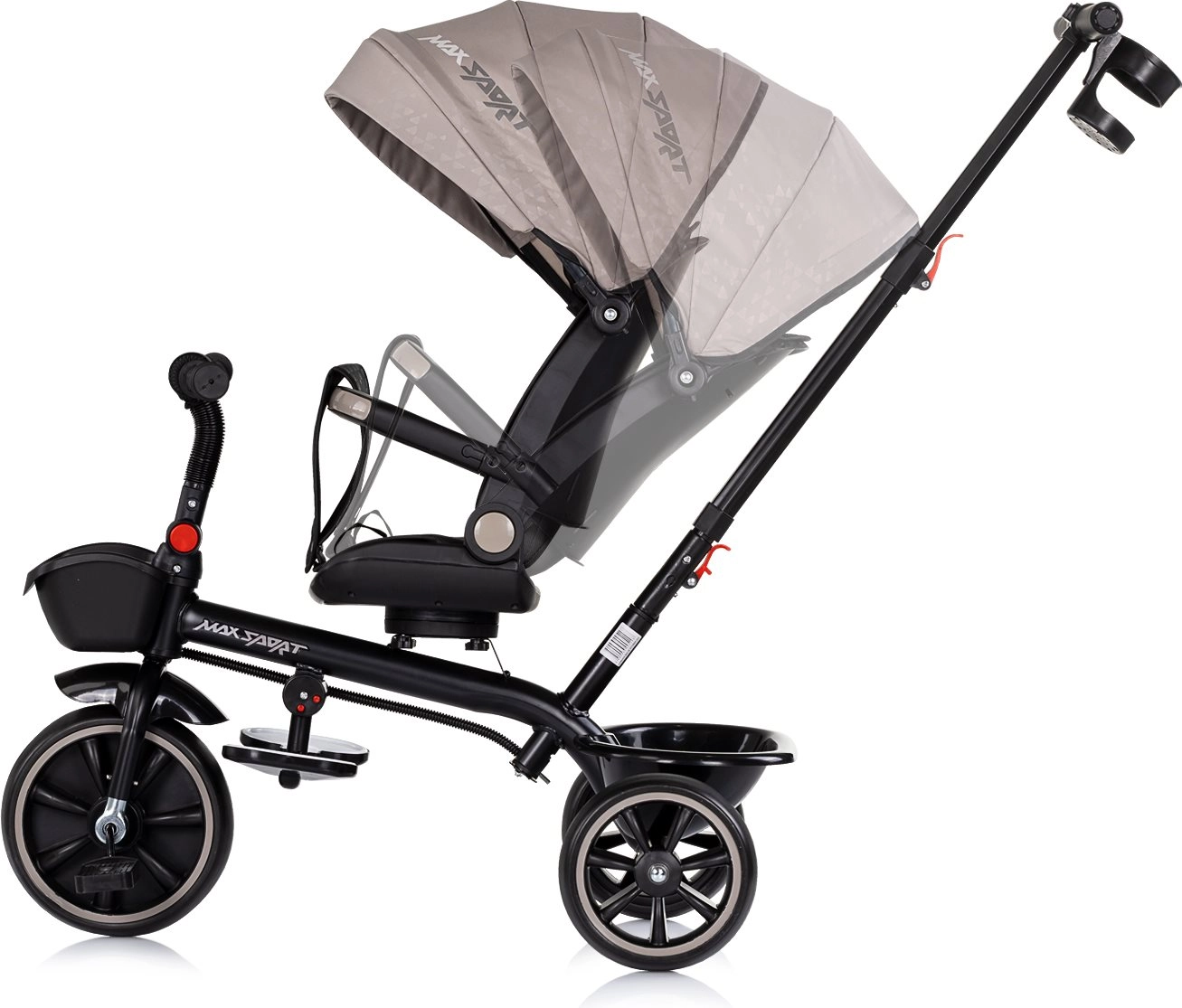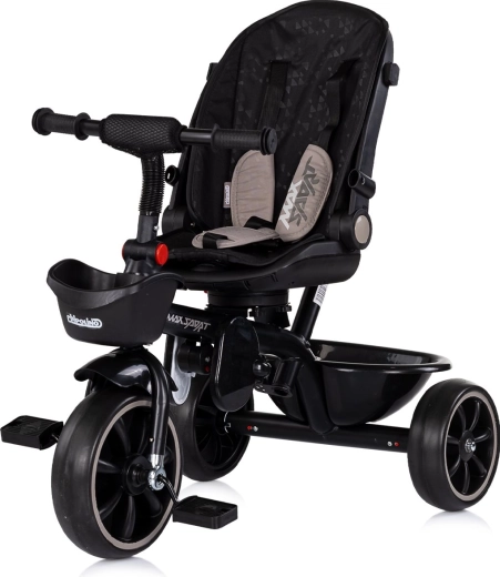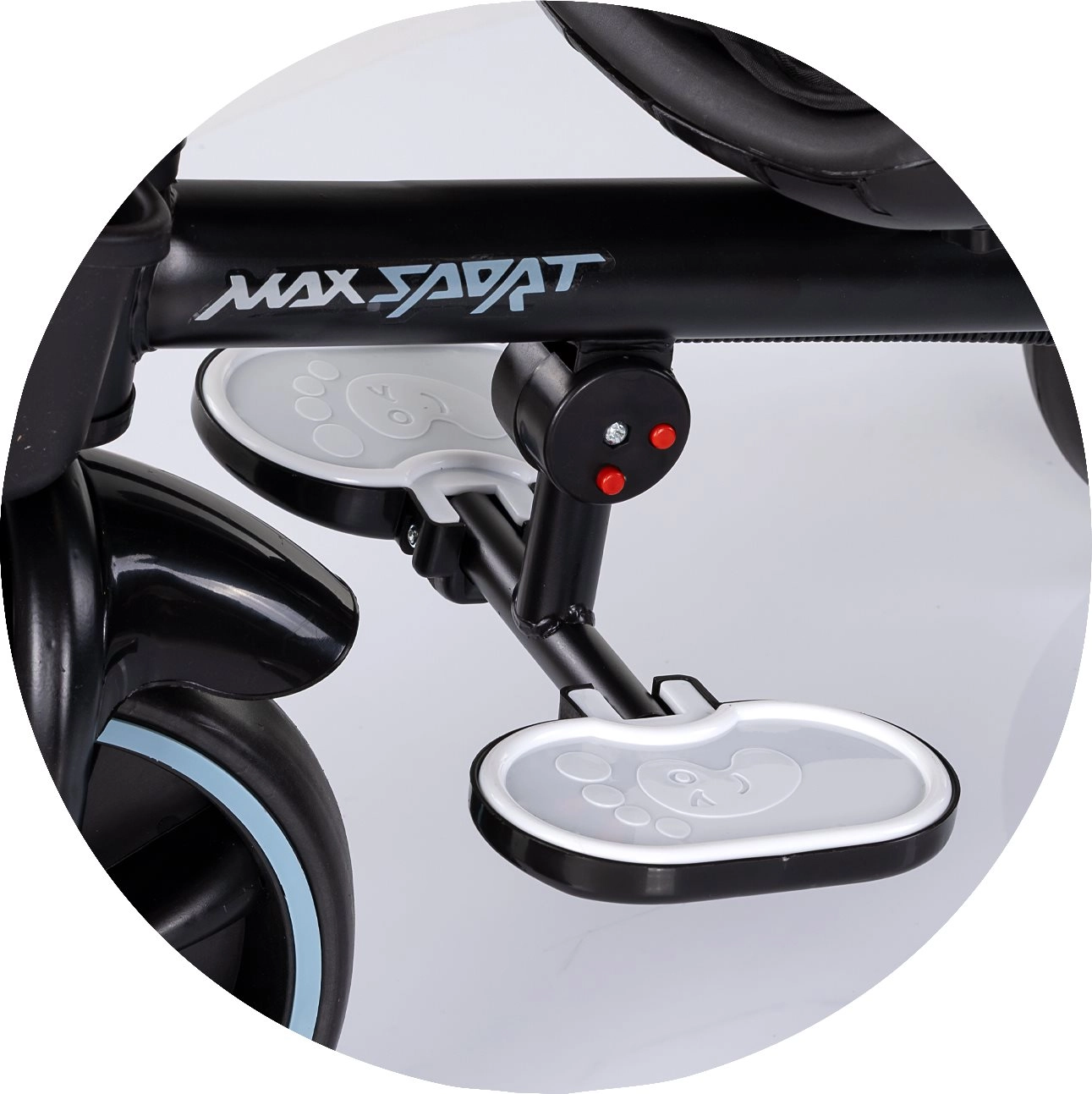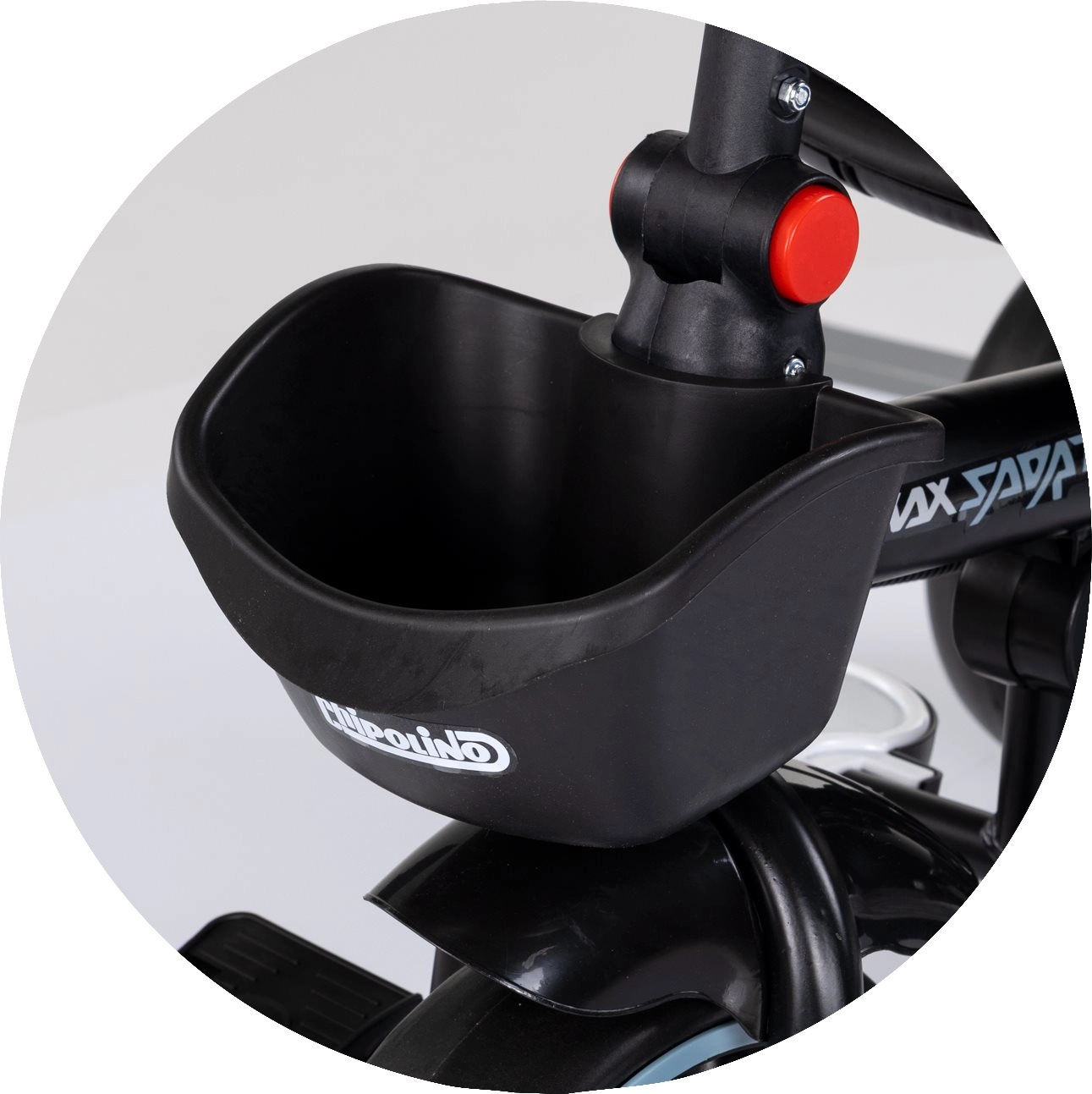 Maksimaliam komfortui triratis turi minkštą tekstilinį paminkštinimą, saugos diržą, nulenkiamas pakojas ir erdvius krepšelius priekyje ir gale. Reguliuojama tėvų rankena su dviem aukščio padėtimis leidžia užtikrintai valdyti kryptį. Sulankstomas stogelis su saulės skydeliu saugo nuo saulės, o gėrimo laikiklį galima tvirtinti dviejose pozicijose.