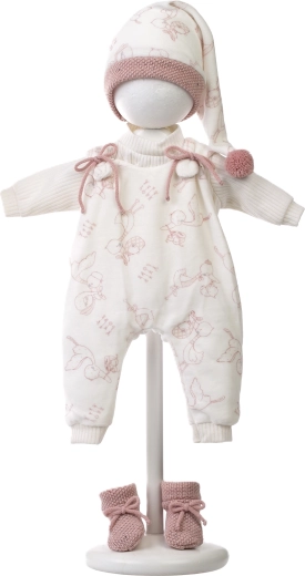 Rinkinyje yra bodis/kombinezonas su mielu raštu, ilga kepurytė ir megztos batelės švelnių spalvų – viskas iš malonių audinių, kad būtų lengva aprengti ir patogu lėlei.