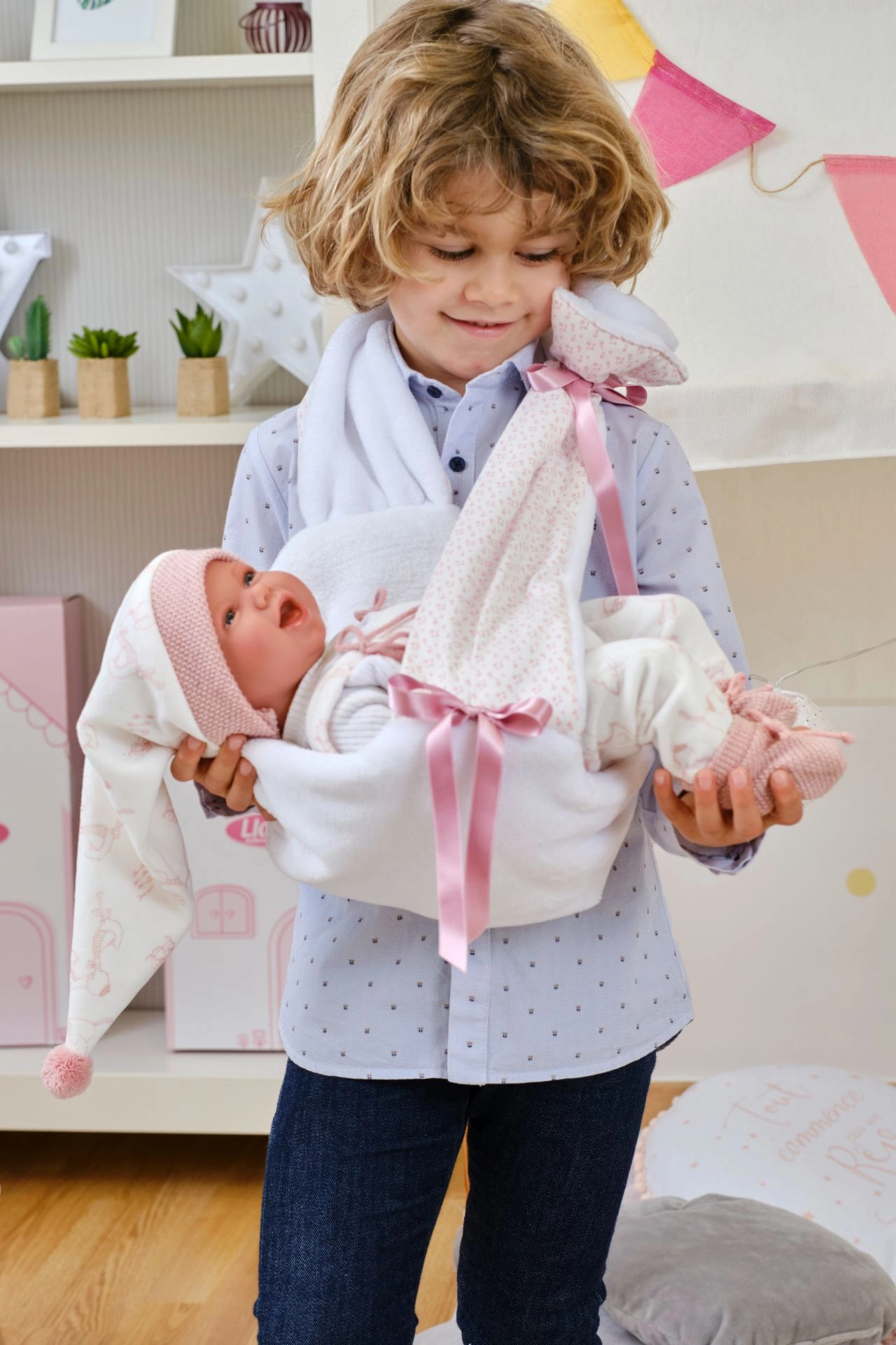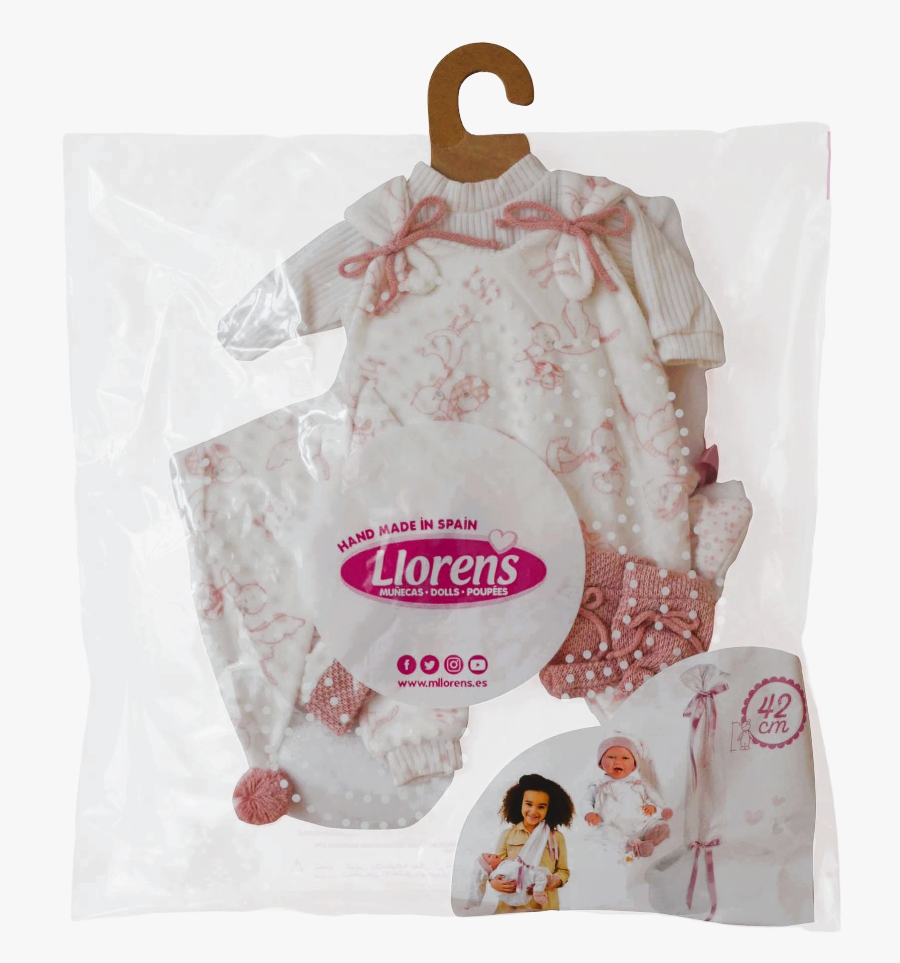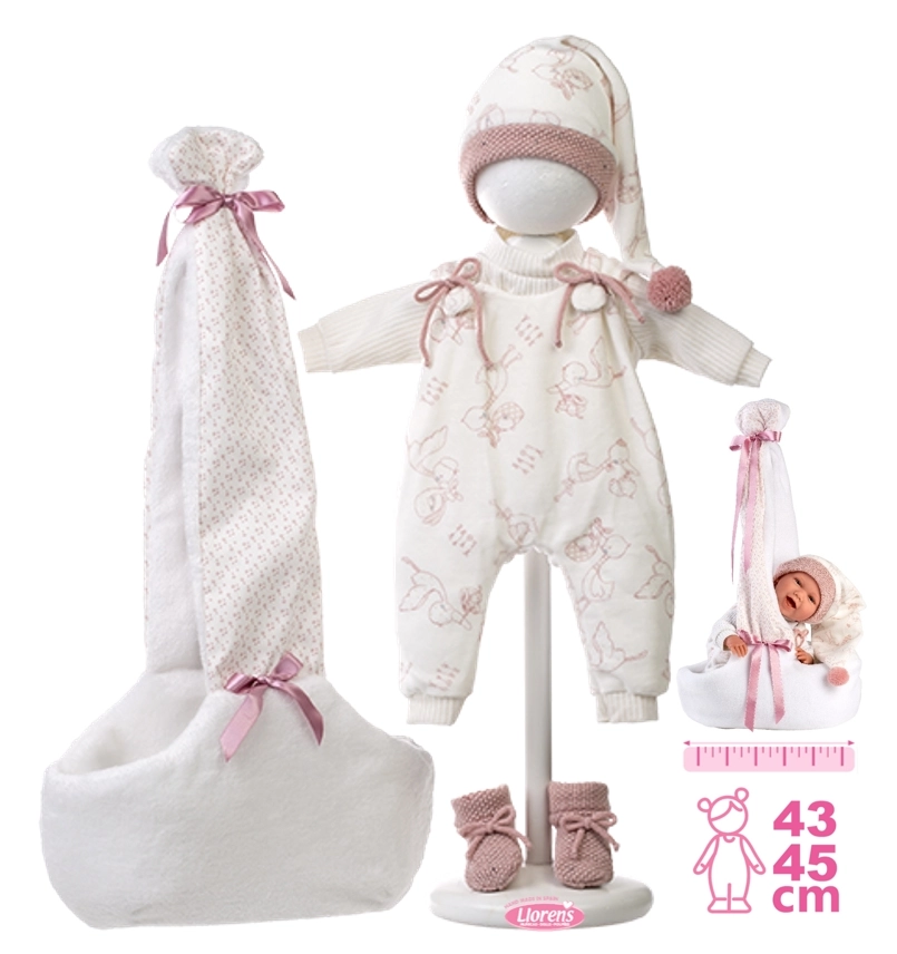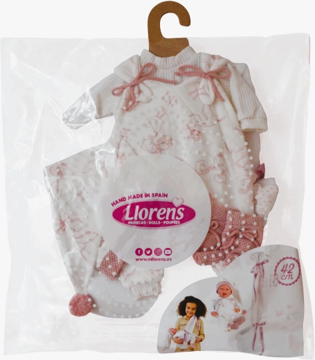 Rinkinys rankų darbo Ispanijoje ir sukurtas Llorens NEW BORN 40–42 cm lėlėms. Dėl kokybiško siuvimo ir detalių – tokių kaip kaspinėliai, šonkauliniai apsiuvai ar megztos batelės – rūbeliai atrodo realistiškai ir elegantiškai. Puikiai padeda lavinti smulkiąją motoriką, empatiją ir vaizduotę vaikams.