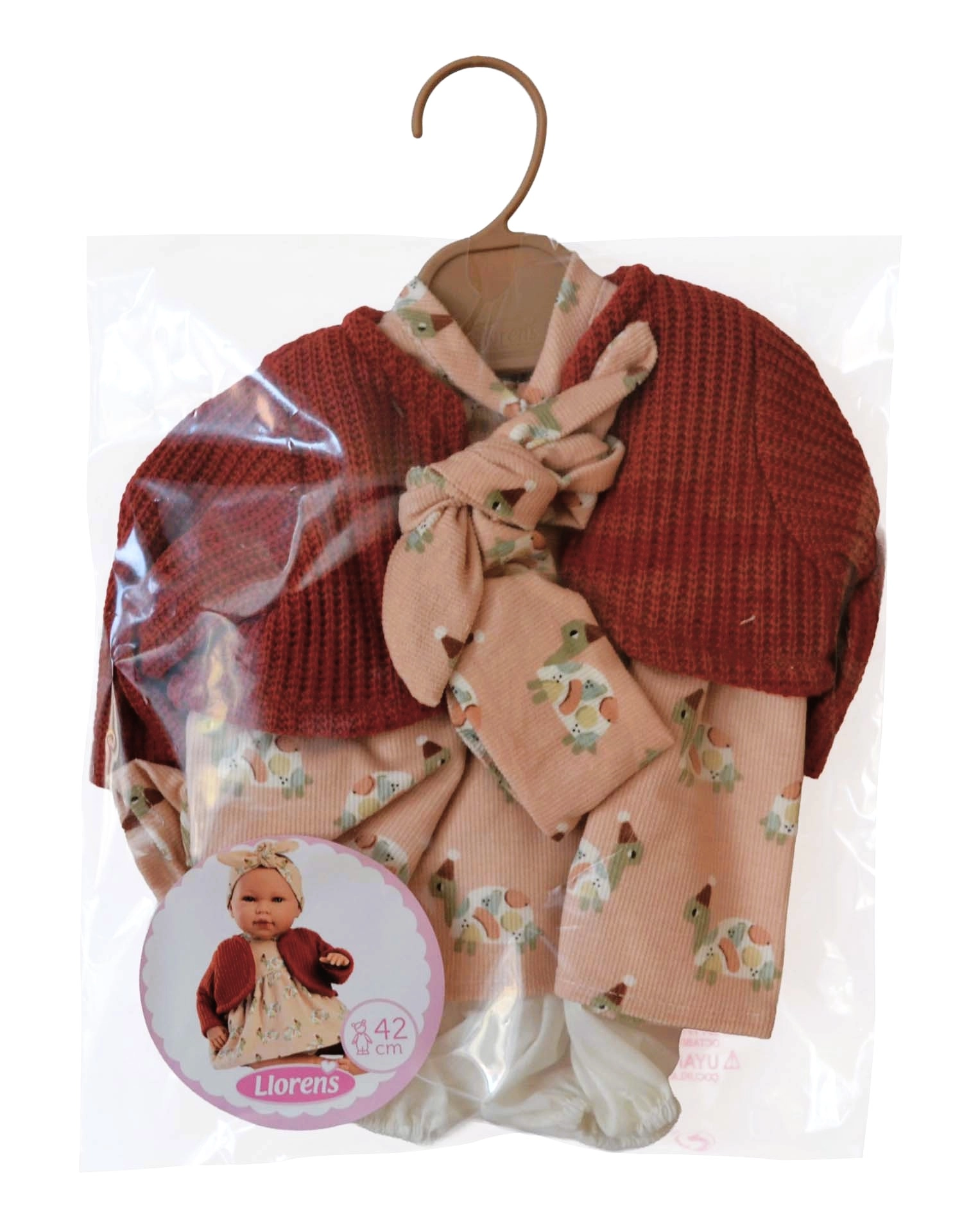 Stilingi 4 dalių drabužėliai lėlei New Born iš prekės ženklo Llorens, tinkami 40–42 cm dydžiui. Rankų darbo Ispanijoje iš kokybiškų medžiagų, pateikiami praktiškame dėkle su pakaba. Puikiai tinka lavinti vaizduotę ir rūpinimosi įgūdžius žaidžiant. Rekomenduojama nuo 3 metų.