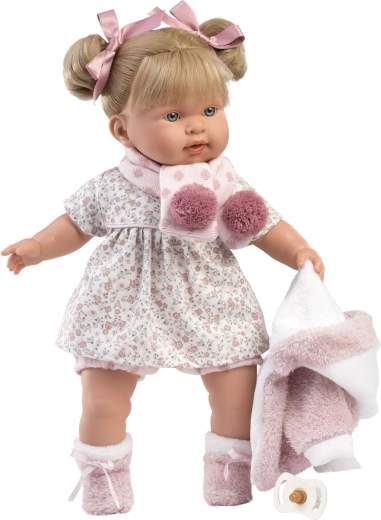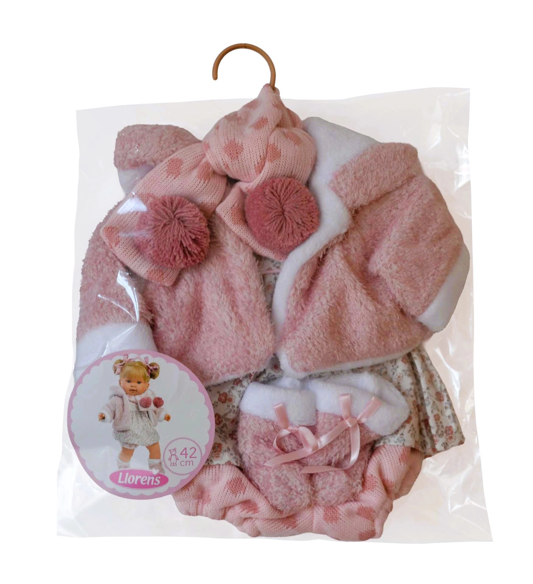 Stilingas LLORENS lėlių rinkinys, skirtas 42 cm dydžiui, pradžiugins kiekvieną mažą puošeivą. Sudėtyje yra 5 kruopščiai suderintos dalys iš minkštų tekstilės audinių – rožinis pūkuotas paltukas su baltu apsiuvu, kepurė/šalikas su bumbulais, kumštinės pirštinės ir gėlėtos suknelės su kelnaitėmis. Drabužėliai rankų darbo Ispanijoje ir pateikiami praktiškame užvalkale su pakaba. Idealu vaidinimo žaidimams ir smulkiosios motorikos lavinimui. Tinka nuo 3 metų.
