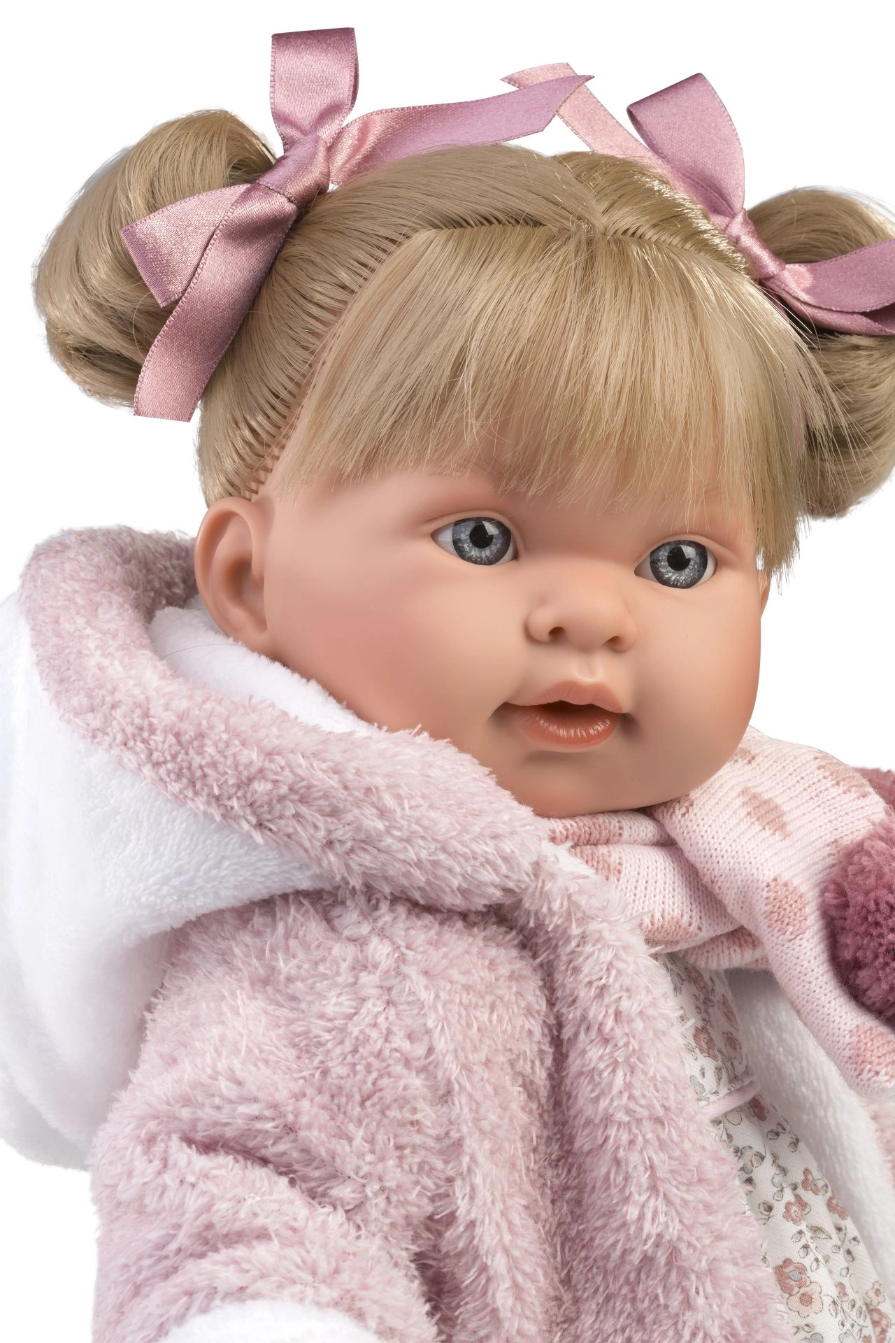 Rožinis pūkuotas paltukas su baltu apsiuvu ir aksesuaras su bumbulais suteikia lėlei žavų žiemos stilių, kuris išryškėja kiekvieno žaidimo metu.