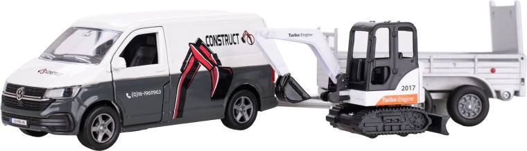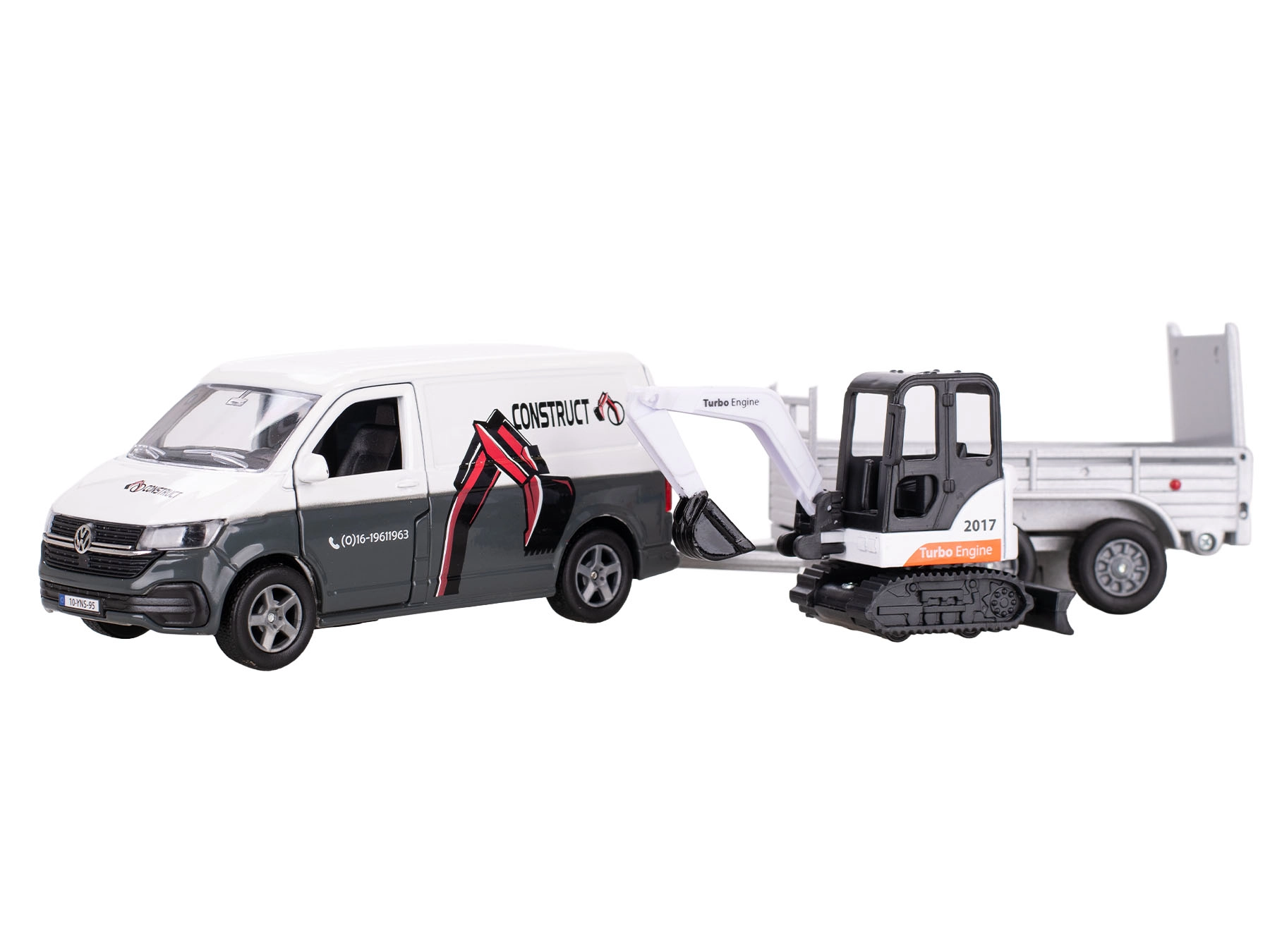 - Realistinis rinkinys: VW Transporter, nuimama priekaba ir funkcionalus mini ekskavatorius