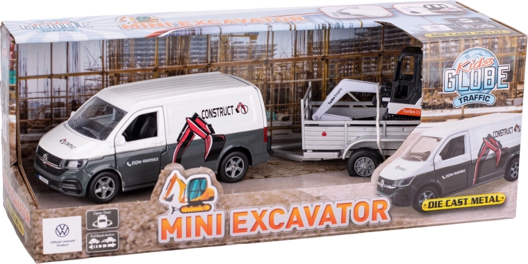 Su Kids Globe Traffic rinkiniu vaikai lengvai susikurs savo statybvietę. Realistiškas VW Transporter su atsukimo mechanizmu saugiai gabena mini ekskavatorių ant nuimamos priekabos, kad jis galėtų iškart pradėti „kasimo“ darbus. Patvarus metalo ir plastiko derinys užtikrina ilgą tarnavimo laiką net intensyviai žaidžiant.