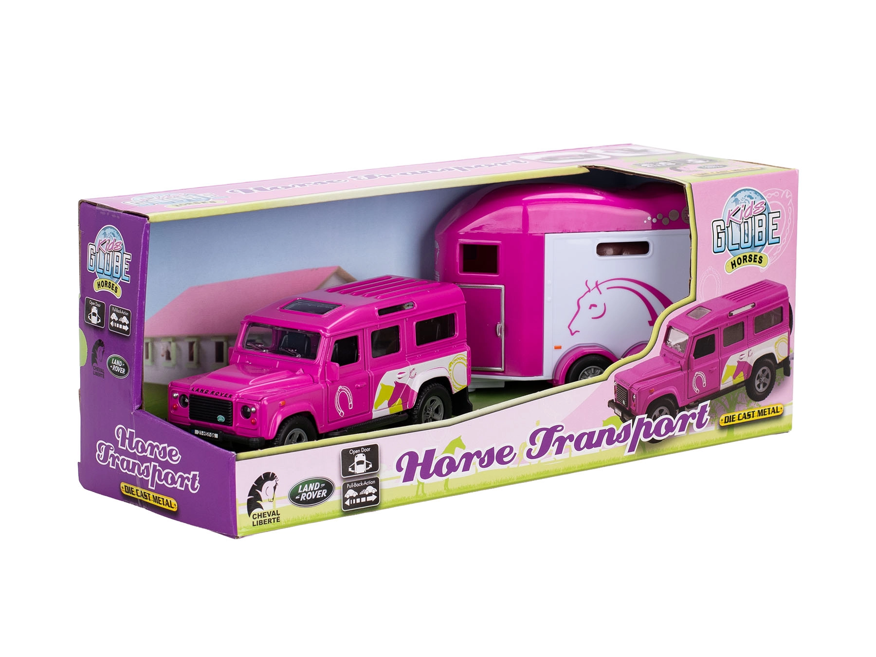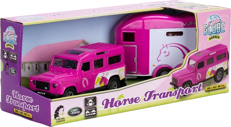 Atraskite realistišką Kids Globe rinkinį su ikonišku Land Rover automobiliu ir priekaba žirgų pervežimui patrauklia rožine spalva. Detalus kėbulo ir salono atlikimas, atsidarančios priekinės durys ir atbulinė eiga užtikrina daug žaidimo galimybių ir pramogų. Dėl metalo ir kokybiško plastiko derinio modelis yra patvarus ir paruoštas kasdieniam žaidimui.