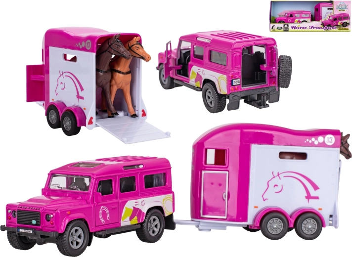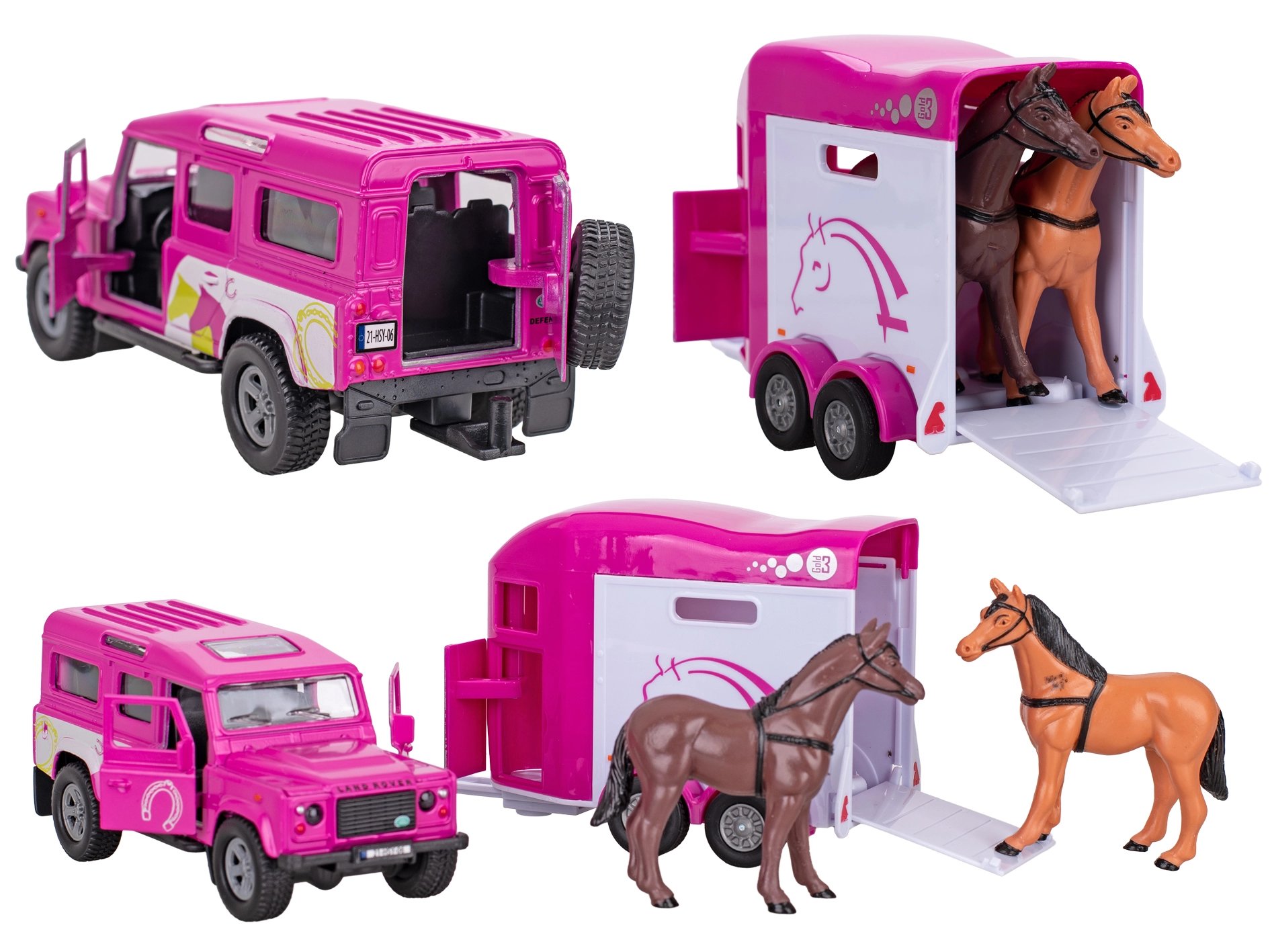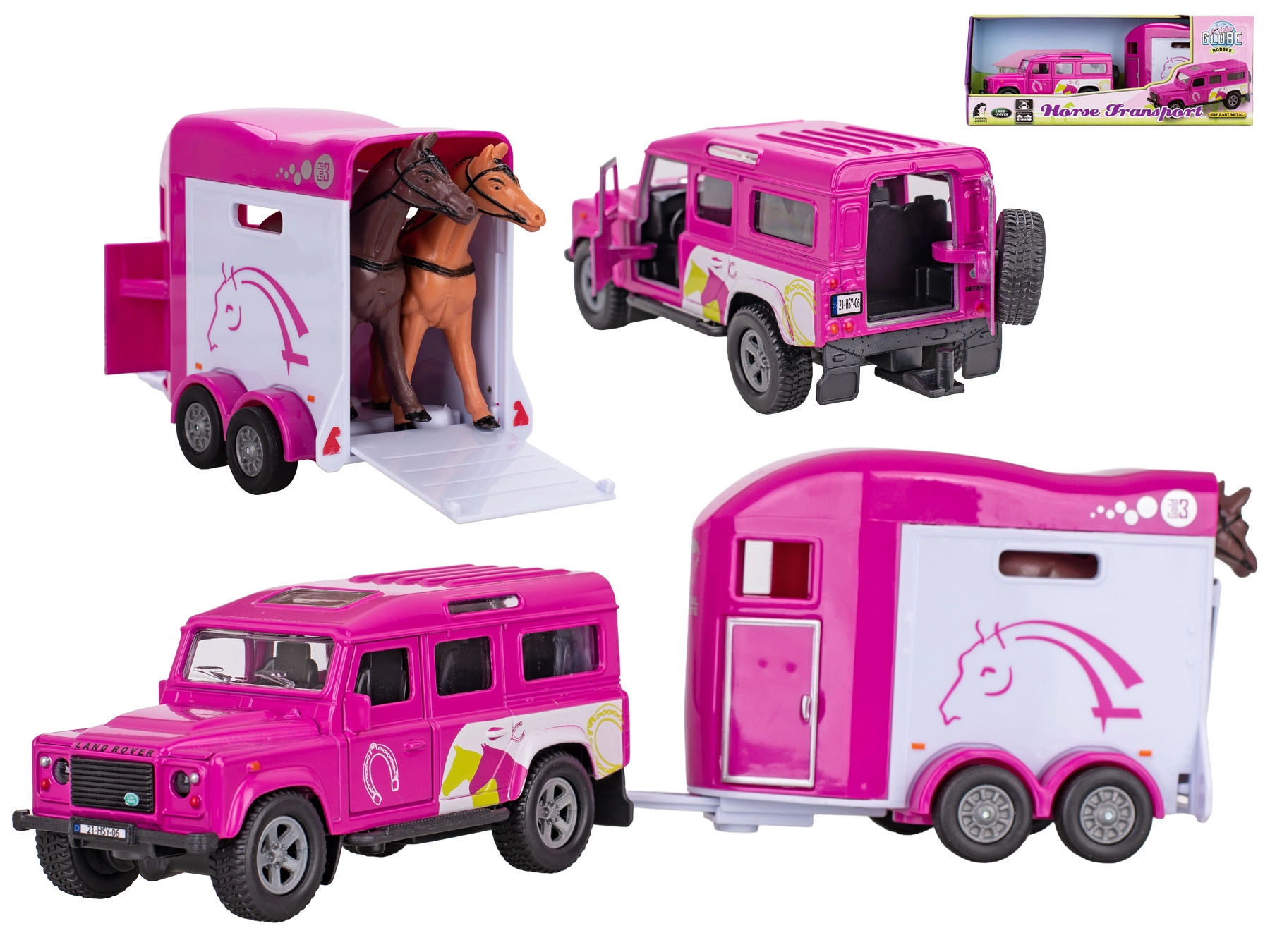 Stilingas metalinis Land Rover su priekaba žirgams rožinės spalvos pradžiugins visas mažąsias jojimo ir fermų mylėtojas. Jis siūlo atbulinės eigos mechanizmą lengvam važiavimui, atsidarančias priekines duris ir patvarią metalo ir plastiko konstrukciją. Priekaba pritaikyta saugiam žirgų figūrėlių pervežimui (nėra komplekte). Rinkinio ilgis 28 cm, o dėžutės pakuotė paverčia jį puikia dovana vaikams nuo 3 metų.