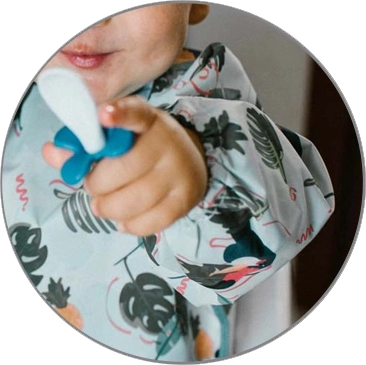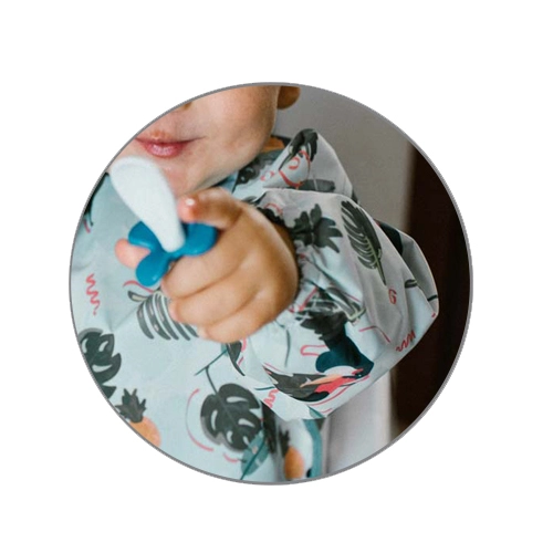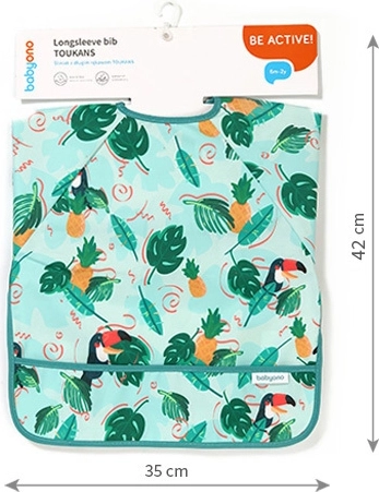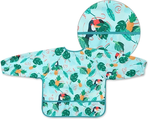 Stilingas ir funkcionalus seilinukas su tukanų raštu suteikia pilną liemens ir rankovių uždengimą, tad drabužiai išlieka švarūs per kiekvieną valgymą ar netvarkingą žaidimą. Atsparus vandeniui ir lengvai valomas audinys puikiai tinka pirmajam savarankiškam maitinimuisi ir kūrybinėms veikloms.