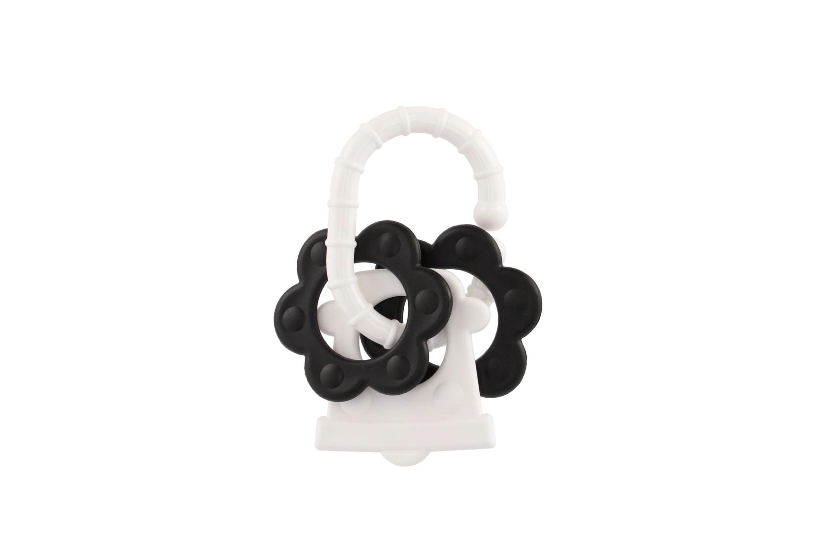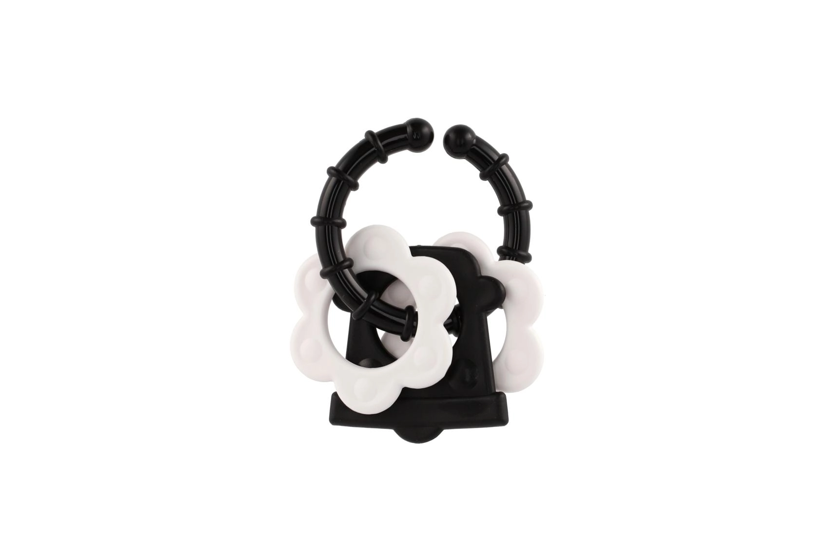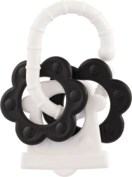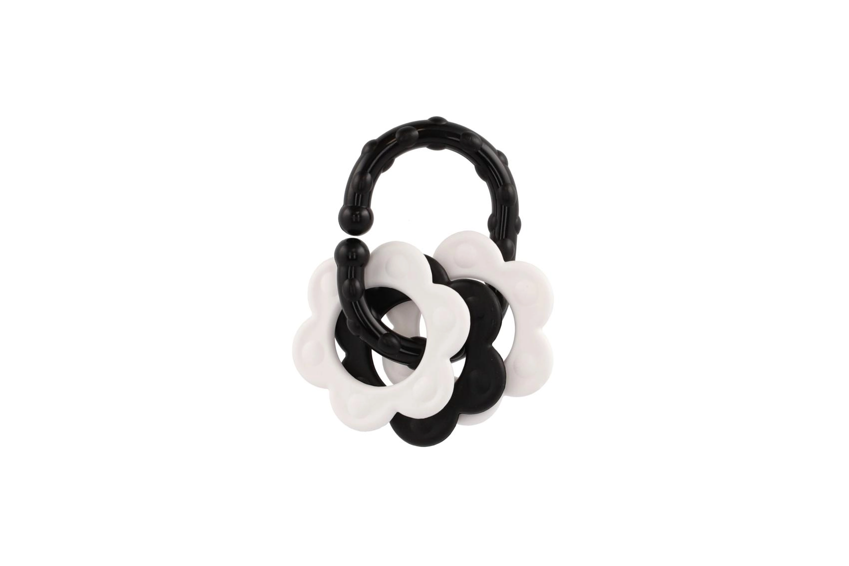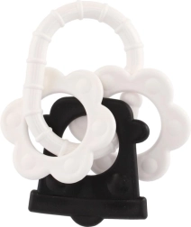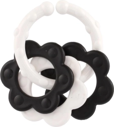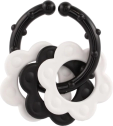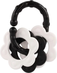 Atraskite specialiai patiems mažiausiems sukurtus kramtukus – kontrastingas juodai baltas dizainas patraukia kūdikio dėmesį ir padeda stimuliuoti vizualinį suvokimą. Dėl patogaus laikiklio kramtuką lengva suimti mažomis rankytėmis, o barškutis suteikia švelnią garsinę stimulaciją.