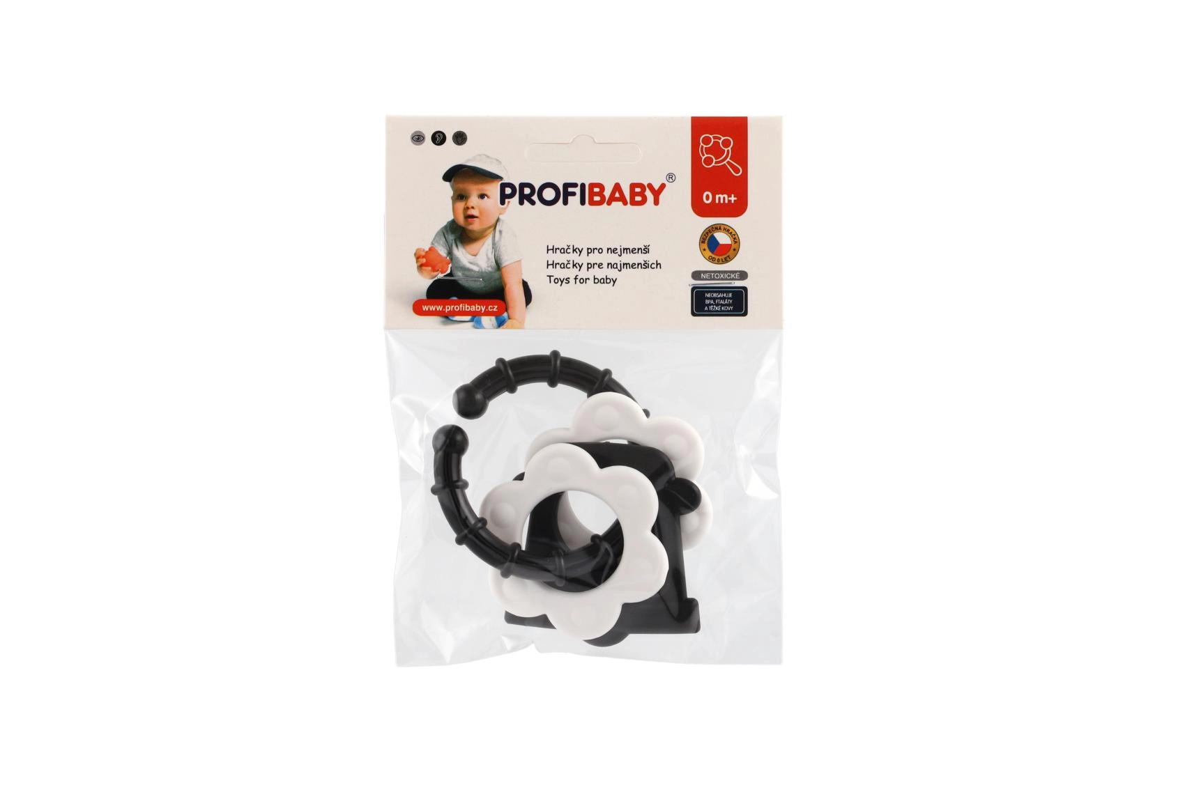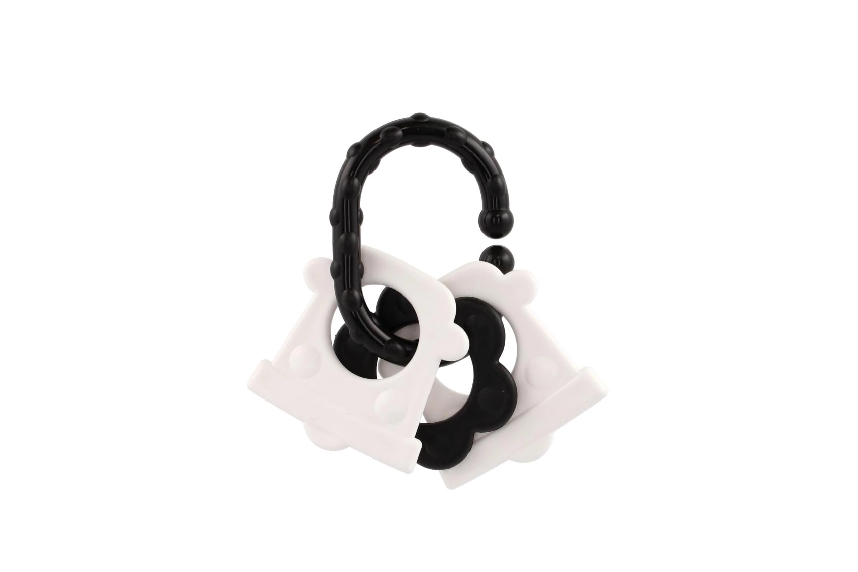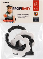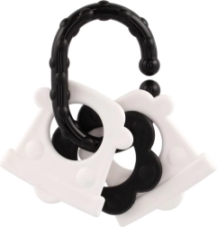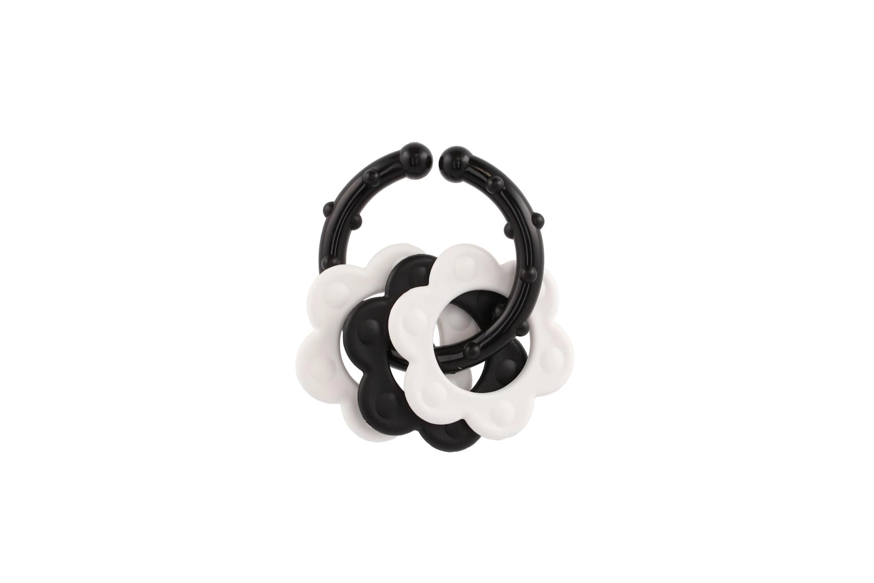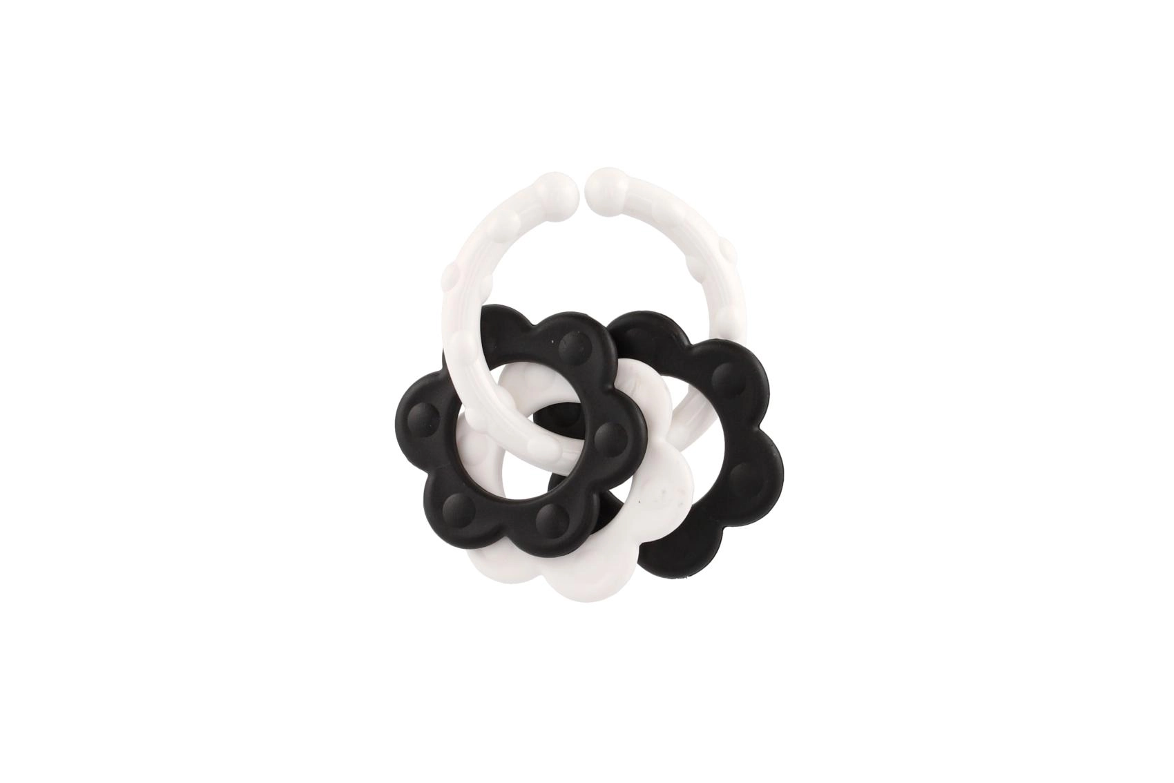 Atraskite specialiai patiems mažiausiems sukurtus kramtukus – kontrastingas juodai baltas dizainas patraukia kūdikio dėmesį ir padeda stimuliuoti vizualinį suvokimą. Dėl patogaus laikiklio kramtuką lengva suimti mažomis rankytėmis, o barškutis suteikia švelnią garsinę stimulaciją.