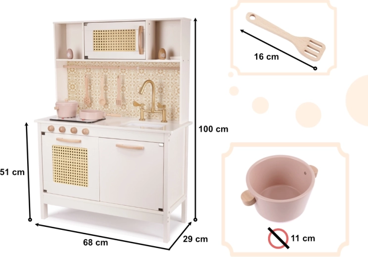 Išmanios laikymo vietos ir praktiški priedai – puodas su dangčiu, keptuvė, druska ir pipirai, samtis, kiaurasamtis ir mentelė – padeda palaikyti „virtuvėje“ tvarką ir moko vaikus erdvės organizavimo. Dauguma elementų pagaminti iš medžio, paviršius švelniai nušlifuotas ir padengtas netoksiškais dažais maksimaliai saugai.