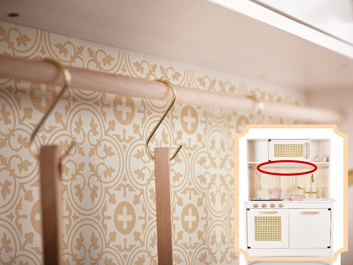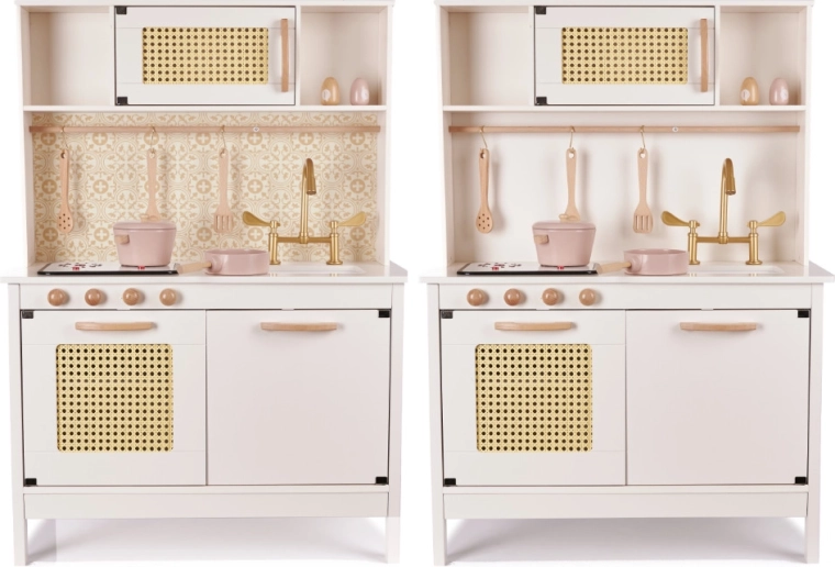 Skatinkite vaikų vaizduotę ir smulkiąją motoriką su virtuvėle, kuri atrodo tarsi tikra. Pasukami mediniai ratukai, atidaromos durelės, juostelė su kabliukais ir išimamas kaitlentės skydelis su šviesos ir garso efektais paverčia gaminimą linksma ir saugia pažintimi be rizikos. Dvipusis fonas (lygi kreminė/oramentinė tapetų pusė) leidžia lengvai keisti virtuvėlės išvaizdą pagal nuotaiką.
