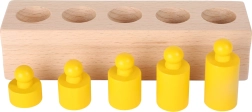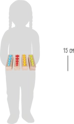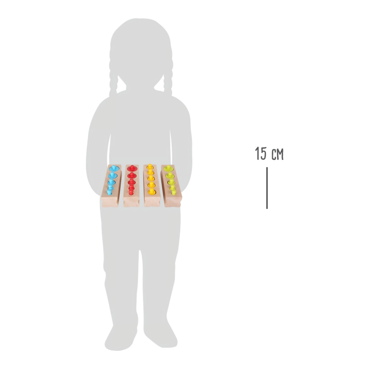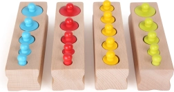 Mediniai spalvoti cilindrai padeda vaikams suprasti raštus ir priimti sprendimus dėl teisingo išdėstymo.