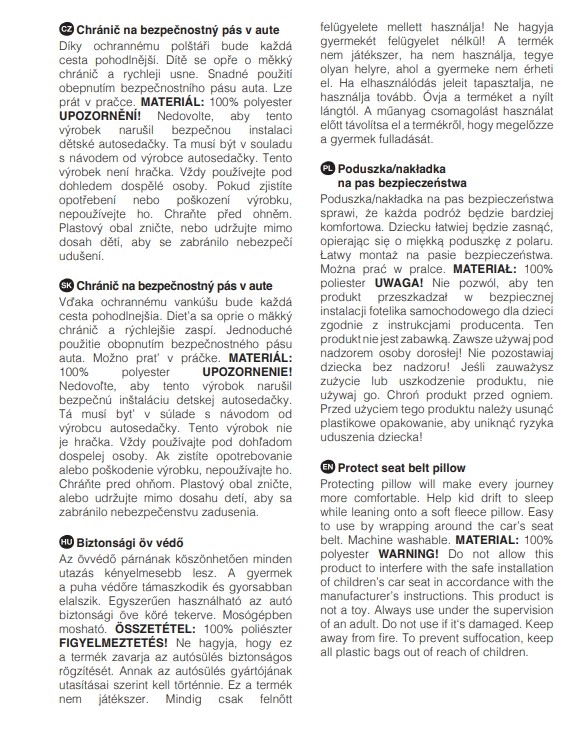 Montavimas trunka akimirką – apsaugą tiesiog apvyniokite aplink diržą ir pritvirtinkite. Dėl kompaktiškų matmenų puikiai tinka daugumai automobilinių diržų ir gali būti be vargo skalbiama skalbyklėje 30 °C temperatūroje.