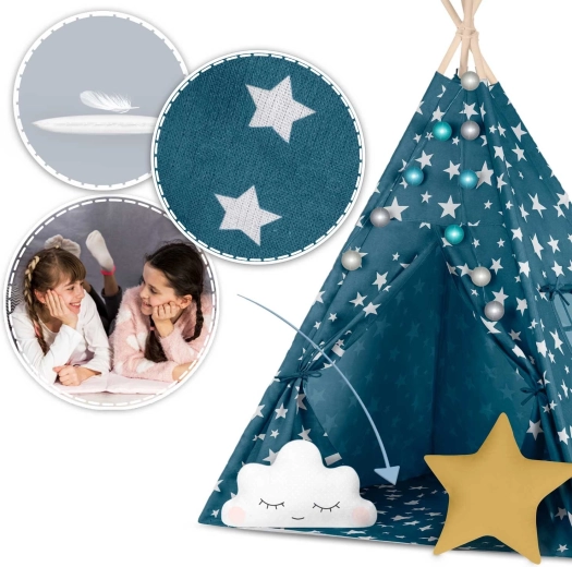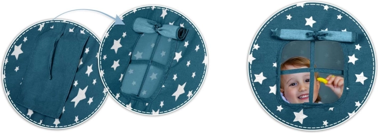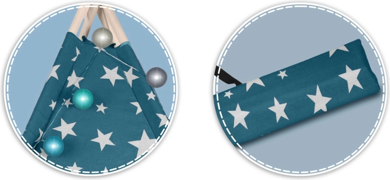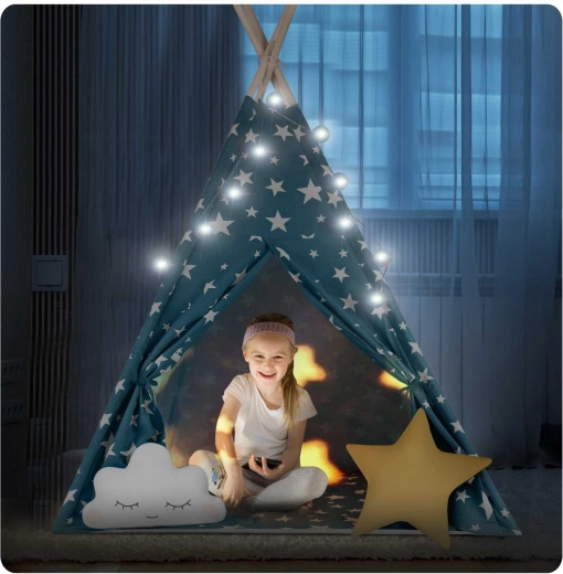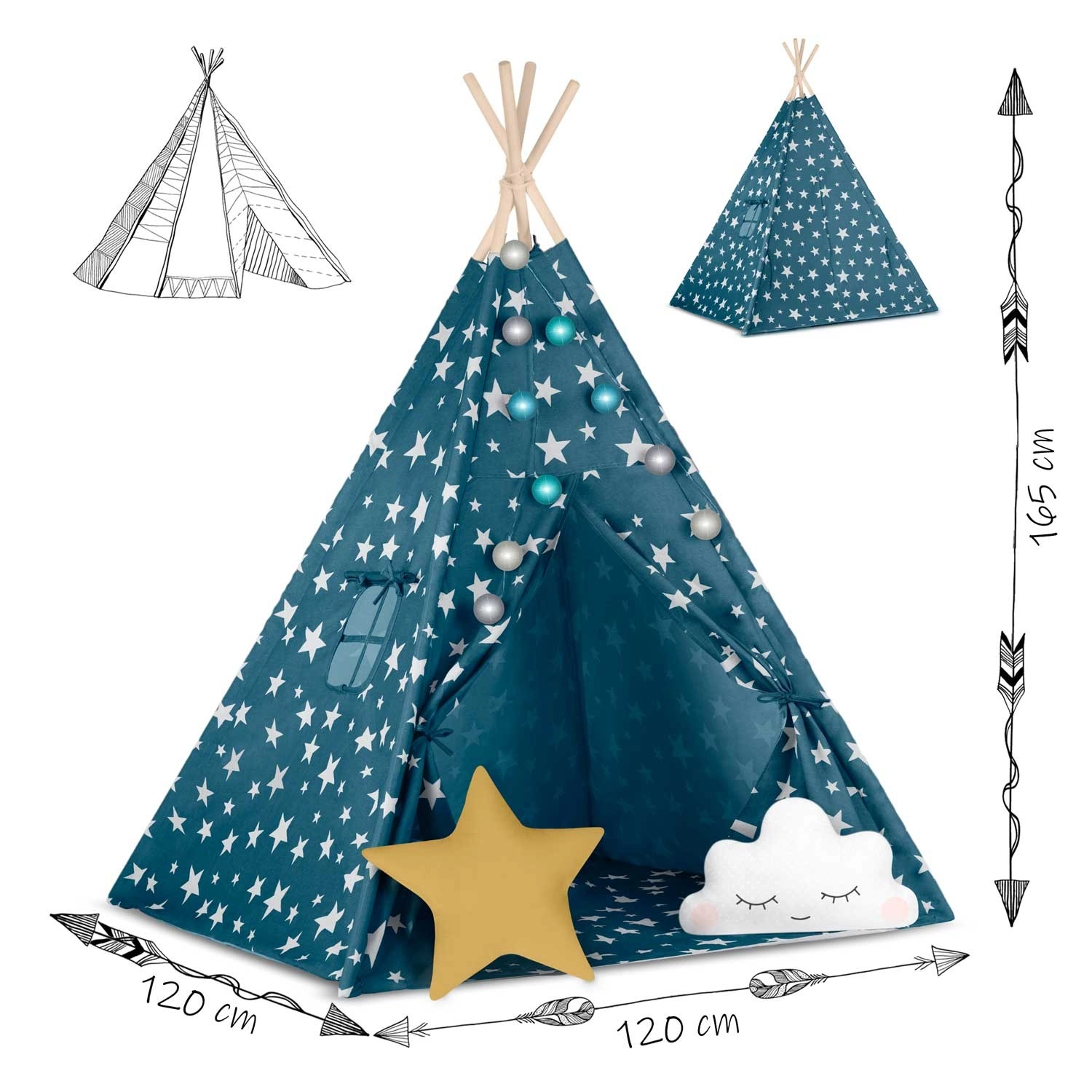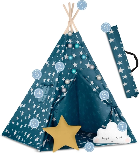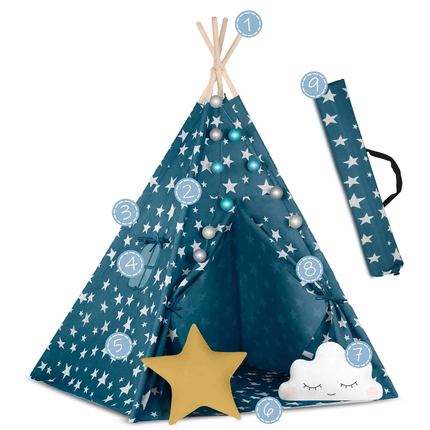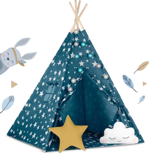 Padovanokite vaikams jų pačių „bazę“ žaidimams, skaitymui ir poilsiui. Nukido vigvamas švelniai mėlynos spalvos su žvaigždutėmis derina natūralias medžiagas, estetišką dizainą ir funkcines detales – nuo atidaromo langelio iki surišiamų įėjimo sklendžių. Įsiūtas pagrindas laikosi vietoje, o kartu su dviejomis minkštomis pagalvėlėmis suteikia maksimalų komfortą.