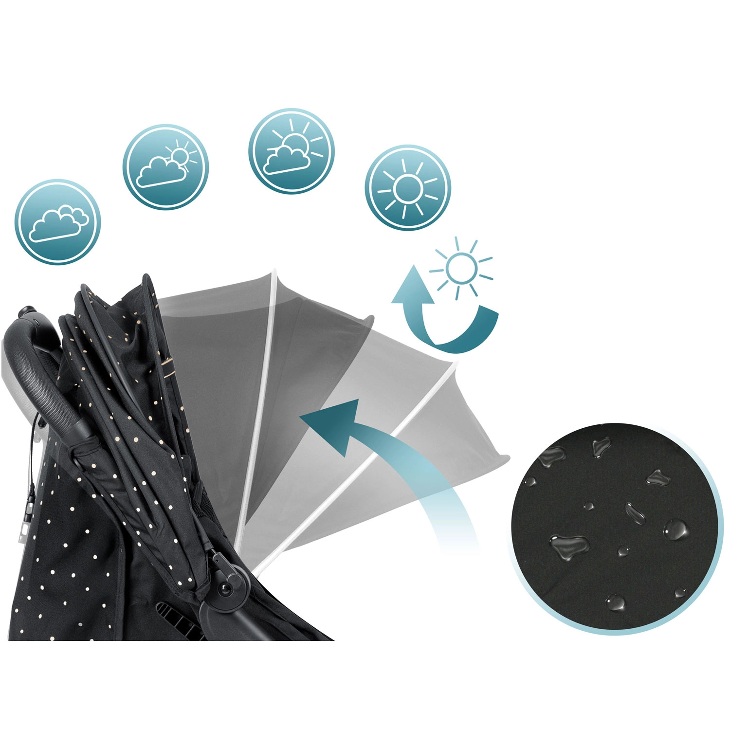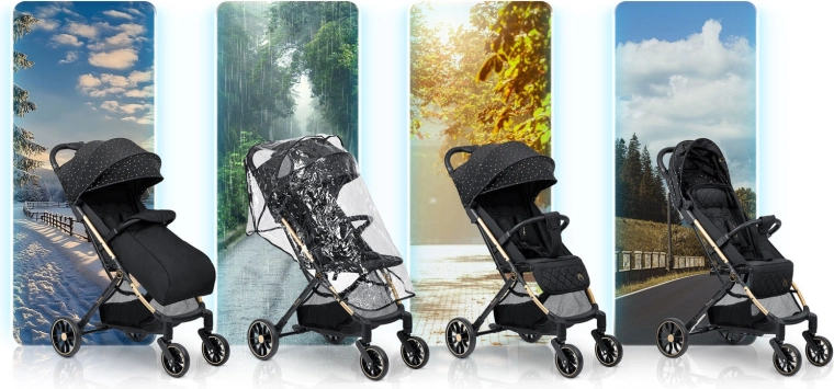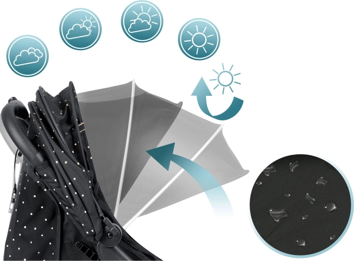 Kelių padėčių stogelis saugo vaiką nuo saulės, vėjo ir lengvo lietaus. Vandeniui atspari medžiagos danga palengvina priežiūrą ir užtikrina komfortą visais metų laikais.