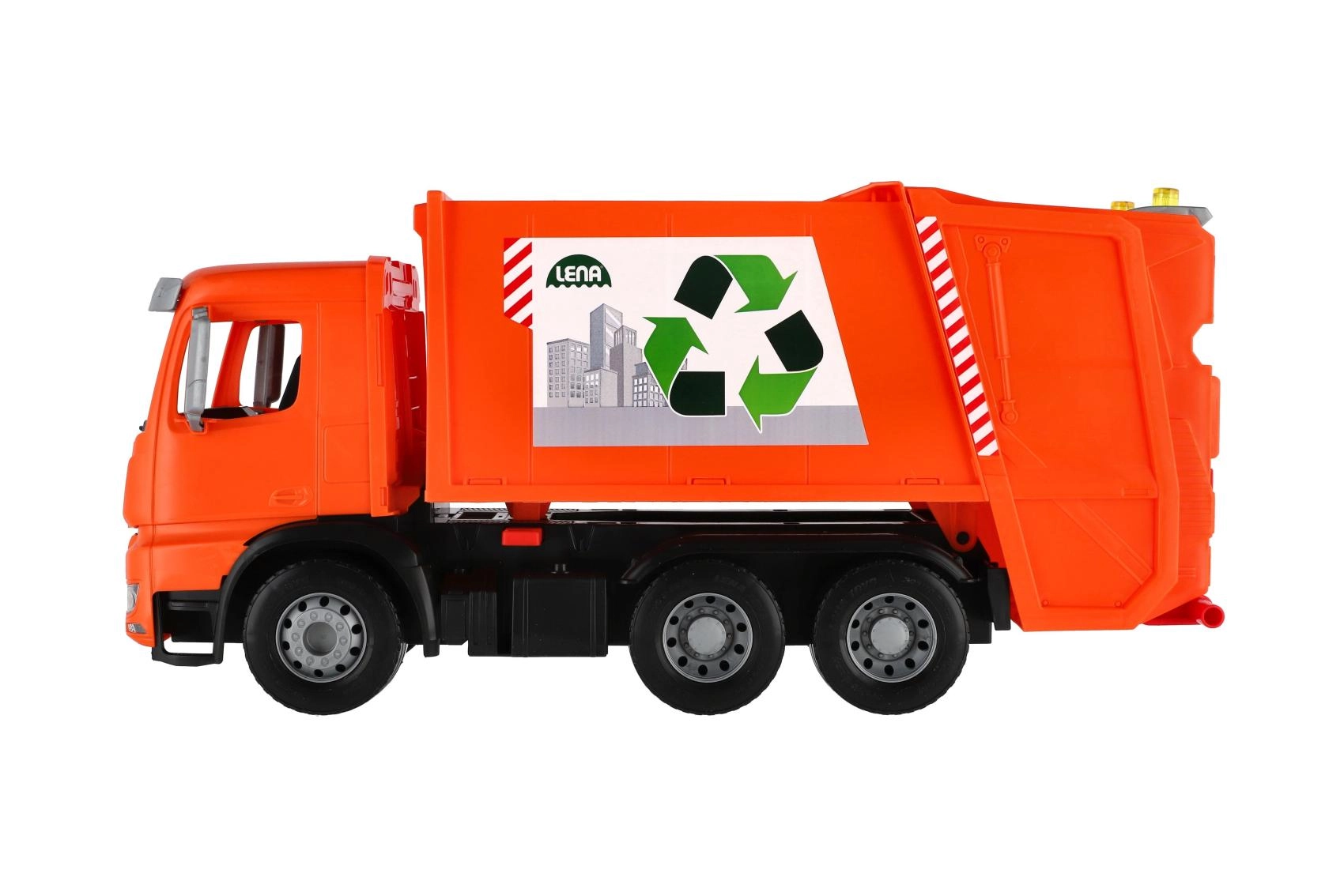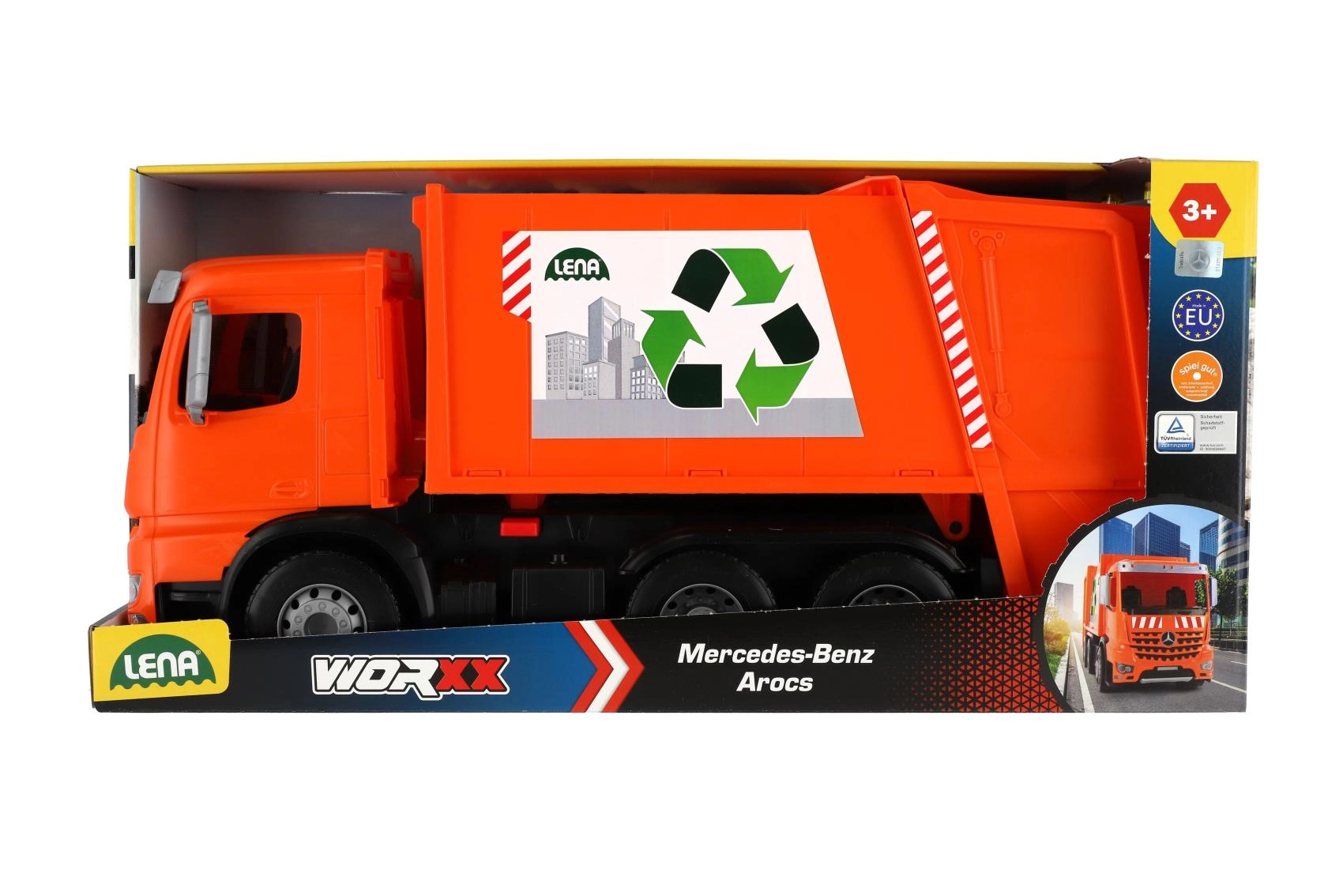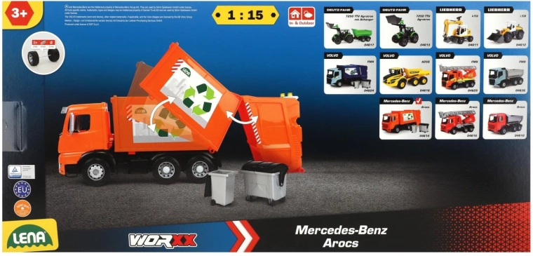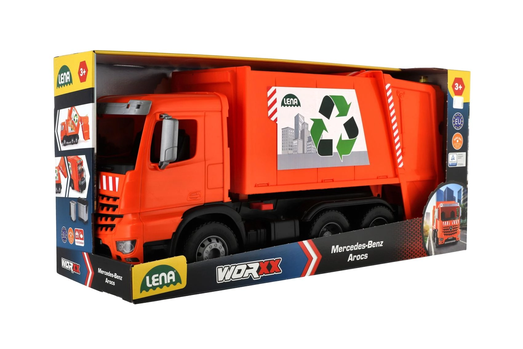 Oranžinis šiukšliavežis MERCEDES AROCS iš LENA suteikia vaikams realistinį atliekų surinkimo žaidimą. Siūlo patvarią plastikinę konstrukciją, tvirtas metalines ratų ašis, apsaugą nuo nepageidaujamo išvertimo ir du konteinerius dar smagesniam žaidimui. Puikiai tinka vaizduotei lavinti, gerinti koordinaciją ir smulkiąją motoriką namuose ir lauke.