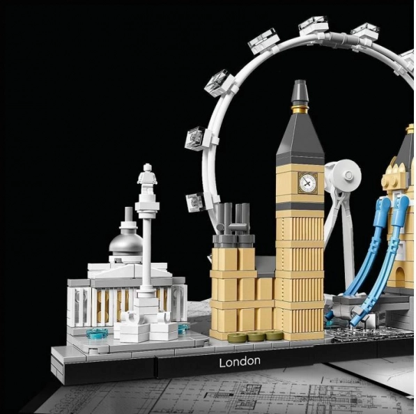 LEGO Architecture Skyline kolekcijos rinkinys tiksliai atkuria žymiausias Londono įžymybes realistiškomis proporcijomis ir spalvomis. Ant elegantiško pjedestalo su dekoratyvine lentele „London“ rasite Nacionalinę galeriją, Nelsono koloną, London Eye, Big Beną (Elžbietos bokštą) ir Tower Bridge tiltą. Skaidrūs elementai pagrinde vaizduoja Temzės upės tėkmę, todėl modelis puikiai atrodo iš bet kurio kampo.