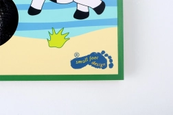 Žaidimo lenta su spalvingomis gyvūnų iliustracijomis ir ryškūs maišeliai daro žaidimą patrauklų ir smagų vaikams.