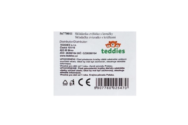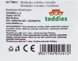 Žaislas pagamintas iš patvaraus, lengvo plastiko su lygiais kraštais ir galimas 3 variantuose su skirtingų formų žiedais ir smagiais gyvūnų motyvais viršuje. Praktiška pakuotė tinklelyje palengvina laikymą ir nešiojimą.