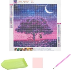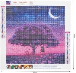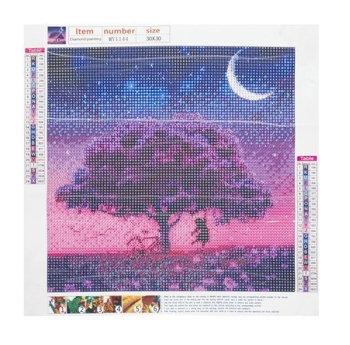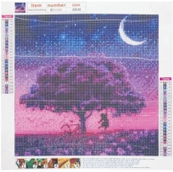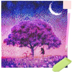 Medžio motyvas rožiniuose–violetiniuose tonuose su pusmėnuliu suteikia žavingą žėrintį efektą, kuris puikiai atrodo rėmelyje ir be jo. Deimantinė mozaika idealiai tinka protui nuraminti, lavinti smulkiąją motoriką ir kūrybiškumą – tinka tiek pradedantiesiems, tiek pažengusiems.