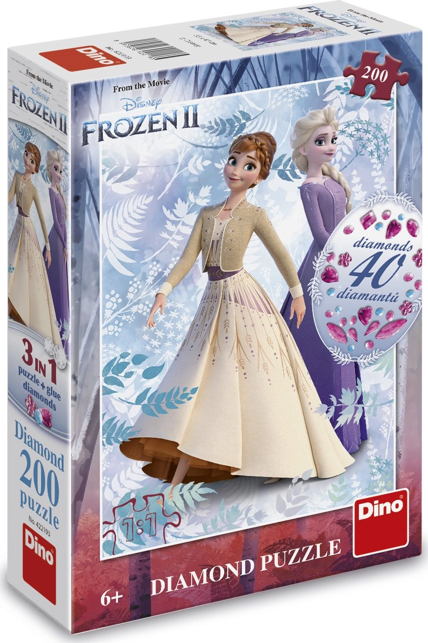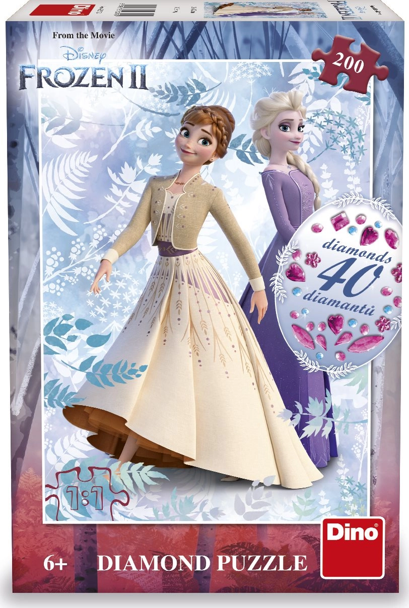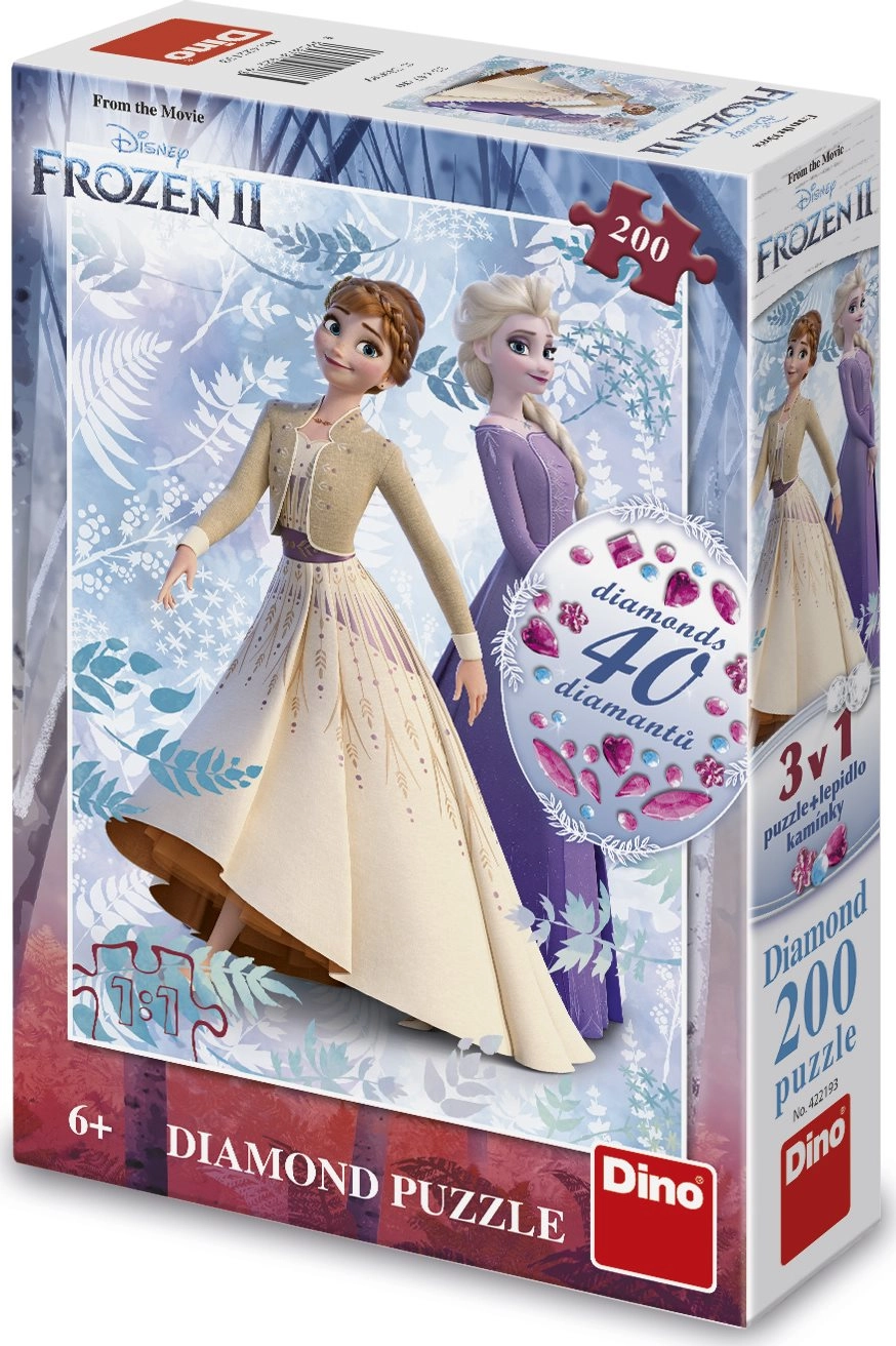 Kerinti dėlionė su Frozen II motyvu turi 200 dalių ir papildomai 40 blizgių deimantų su specialiais klijais kūrybiškam Elzos ir Anos suknelių dekoravimui. Dėliodami vaikai lavins smulkiąją motoriką, vaizduotę ir dėmesio sutelkimą, o dėl kokybiško kartono iš Čekijos dėlionė ilgai išliks puikios būklės.