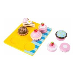 Small Foot saldžių pyragaičių rinkinys pradžiugins visus mažuosius konditerius ir šeimininkus. Ant tvirto padėklo vaikai patieks 6 žavius desertus, kuriuos dėl lipnios juostelės (velcro) galima atskirti ir vėl sudėti į naujas kombinacijas. Žaidimas natūraliai lavina smulkiąją motoriką, kūrybiškumą ir socialinius įgūdžius.